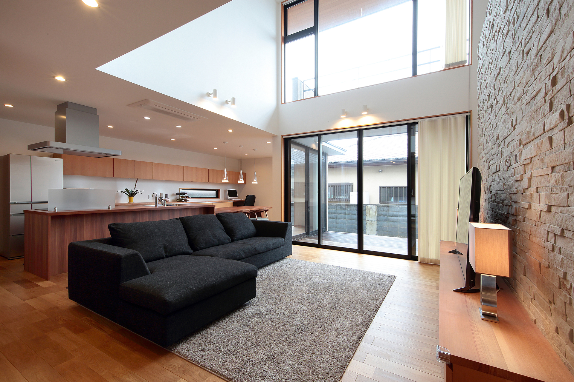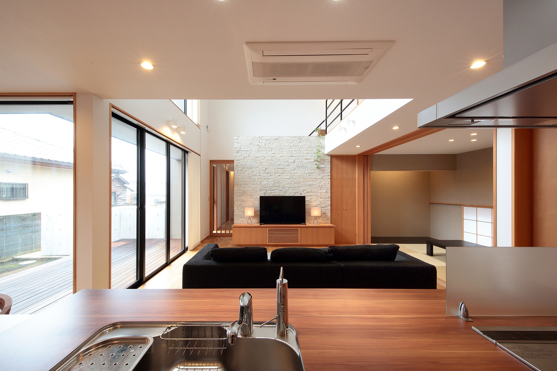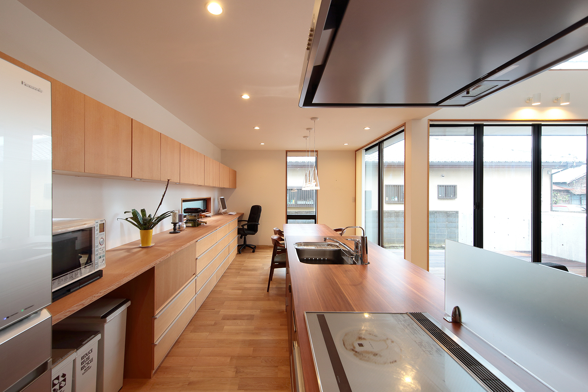 リビング、ダイニング、キッチンが一体的になった住宅のキッチン。キッチンから、LDK全体が見渡せるよう設計をしています。