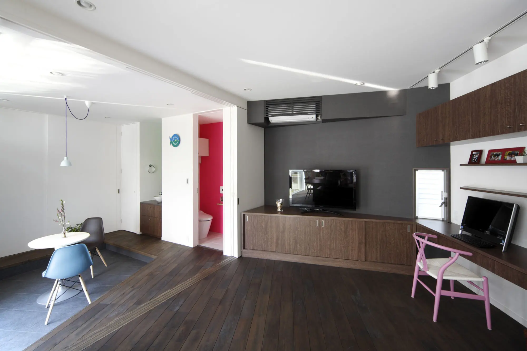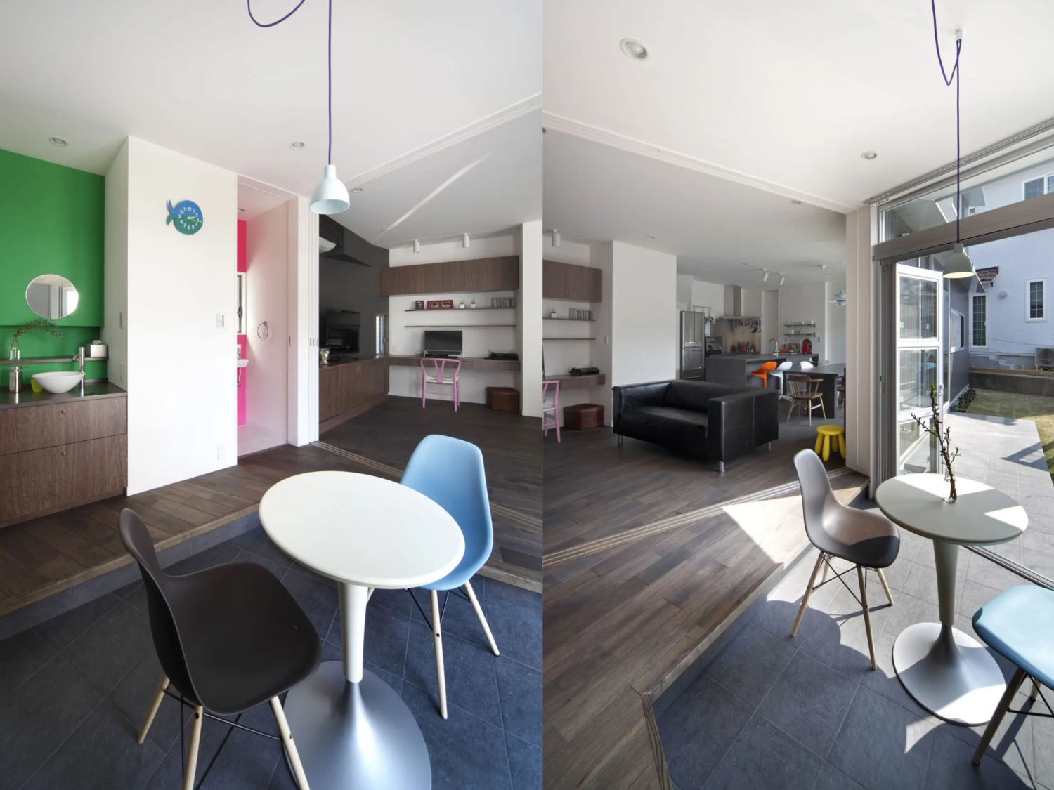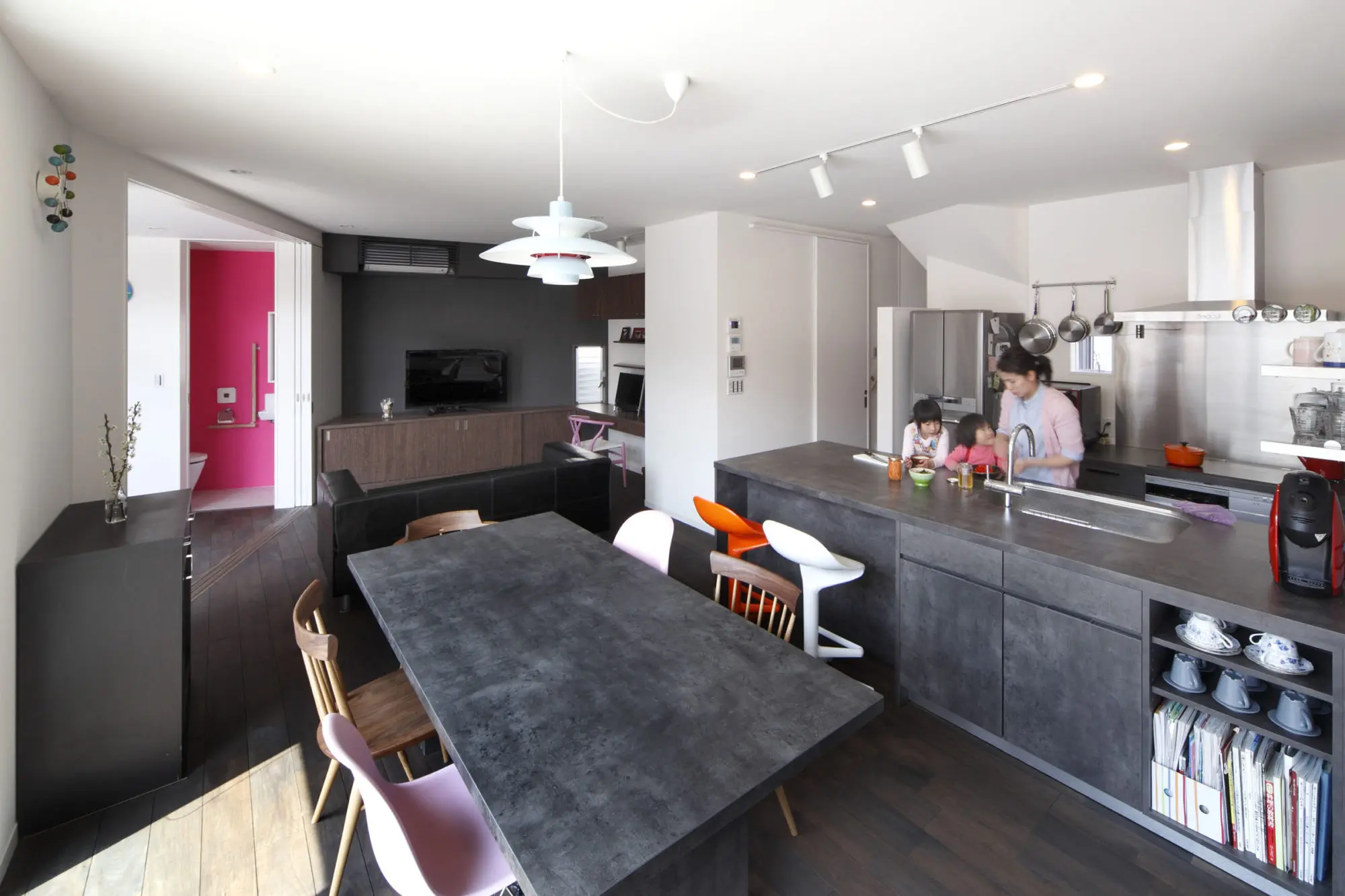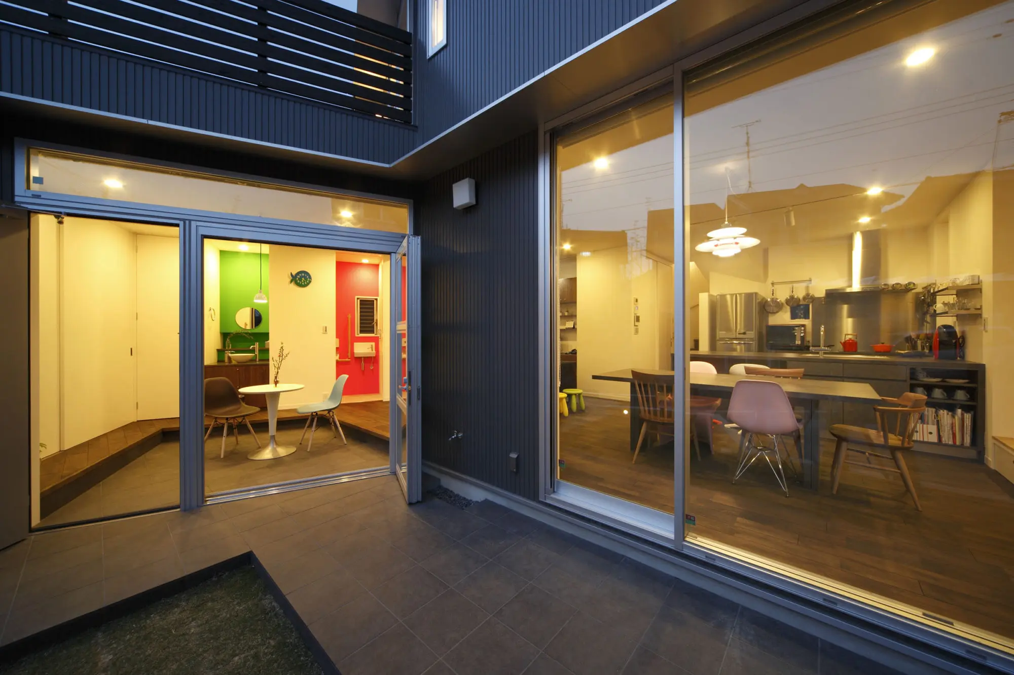 への字型にすることで、キッチンからは1階全体を見渡すことができ、反対に玄関土間からは、室内が見えにくくなります。片引き戸を閉めれば大きな玄関土間が、おしゃれなカフェのような空間に変身。お客様を土間に招き、カジュアルにお茶をしながら会話が楽しめます。