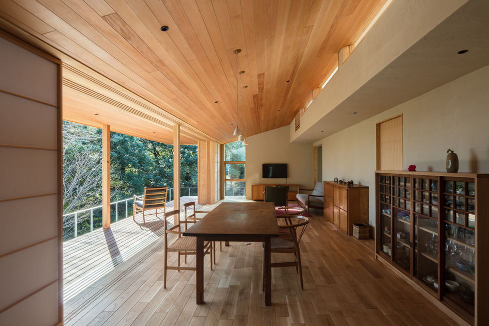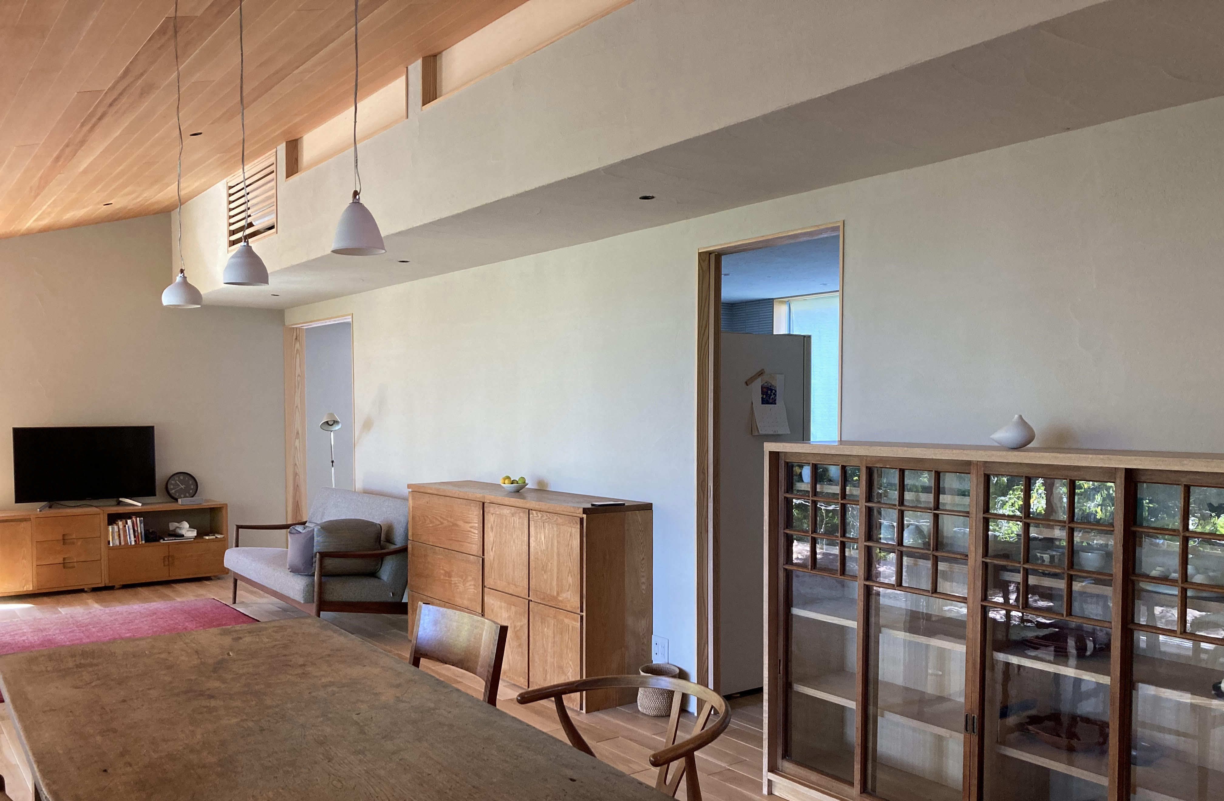 『真鶴の改築住宅とアトリエ』では、普段は開放して1階と2階の空間をつなぎながら、空調を使うなど必要なときには閉じて効率よく使える可動式の仕切りを設けました。