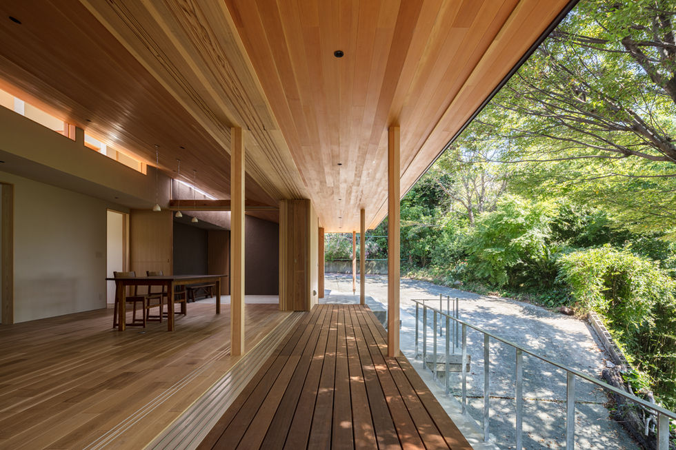 この家は1階が落ち着いた軒の深いリビングで、反対に2階は開けた窓から外光が入る光だまりのような空間です。そこで2階の明かりが間接的に1階に入るように、2つの階をつなぐ開口部をデザインしました。2階からは1階の天井から外の地面まで見え、1階からは2階の窓の外が見えます。どちらの空間も両側の外と繋がっているのを感じられるようにと考えました。また開放時にはそれぞれの階に居るときも家族の気配を感じることもできます。一方、冷暖房を使うなど空間を仕切ったほうが効率的な時は、仕切りを上にスライドさせて開口部を閉じることができます。