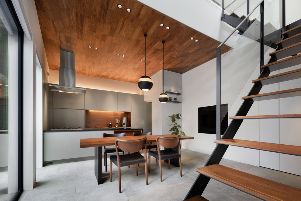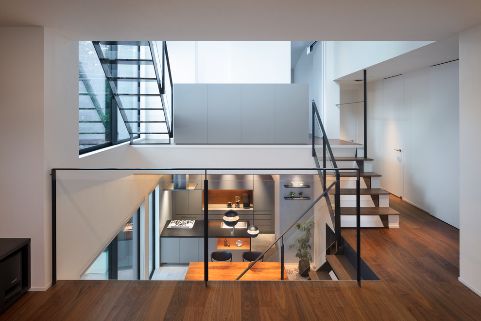 天井高3.1メートルのダイニングキッチン。階段付近は2層吹き抜けの7.5メートルの天井高。この吹き抜けを中心に中2階のリビング、更に一段上に子供部屋を配置しているため、キッチンからは子どもたちの気配を、リビングからは大人たちの気配をなんとなく感じながらも干渉せず、それぞれの時間を過ごせるよう設計をしました。