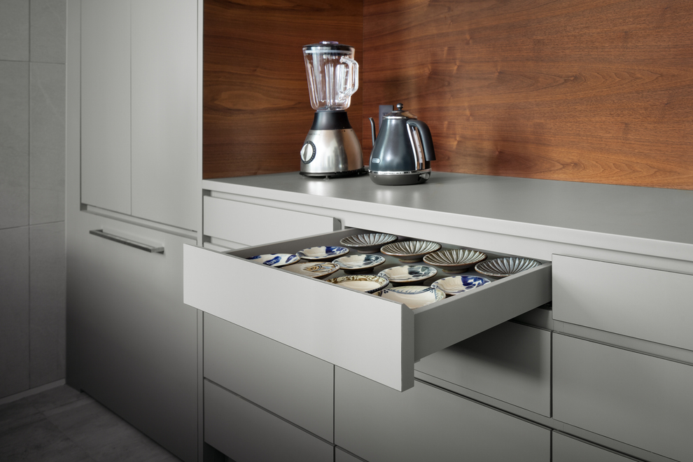 お気に入りの小物や見せたい家電はオープンキッチンの背面収納棚へ。冷蔵庫やゴミ箱など見せたくないものは、壁で目隠しされた冷蔵庫置き場や背面収納の下層部へ。ダイニングに向く収納にはワイングラスなどを納めることで、大人時間を楽しむ工夫も。