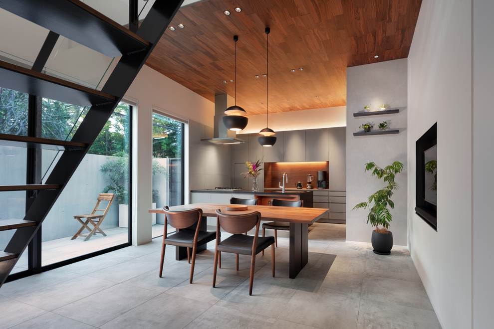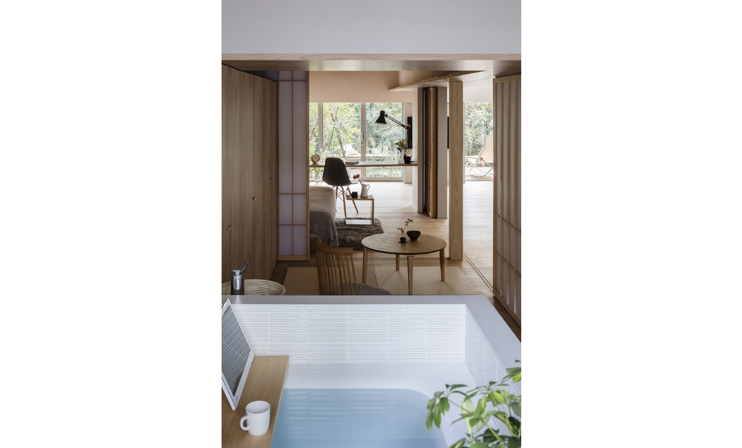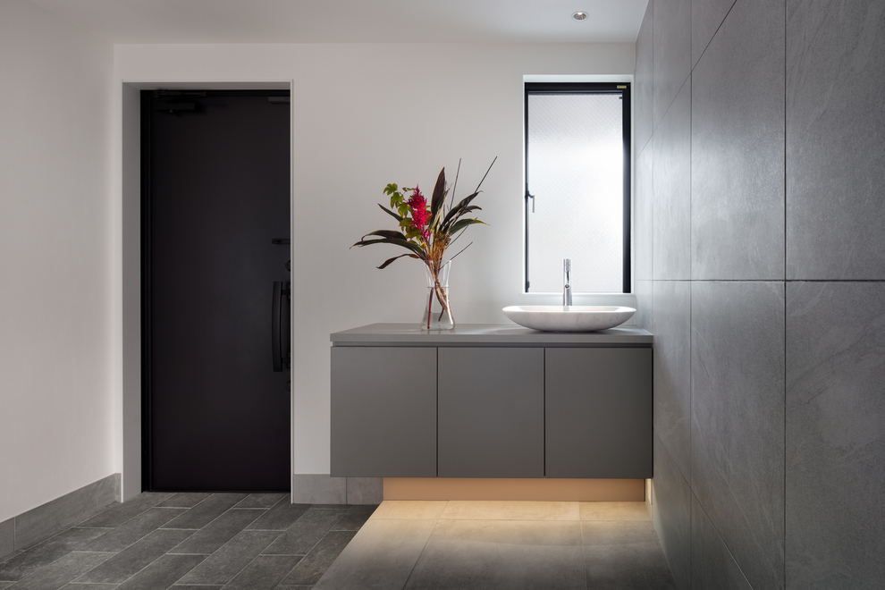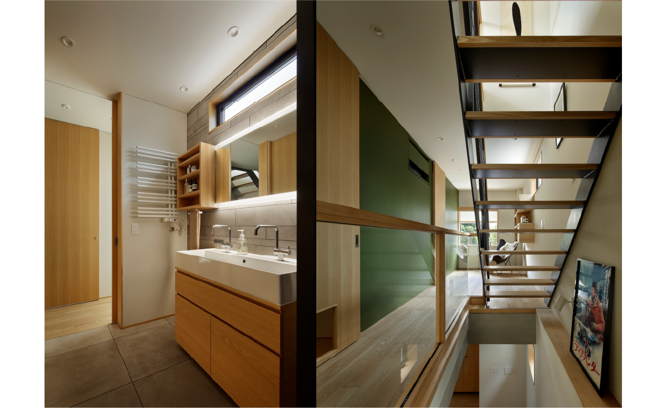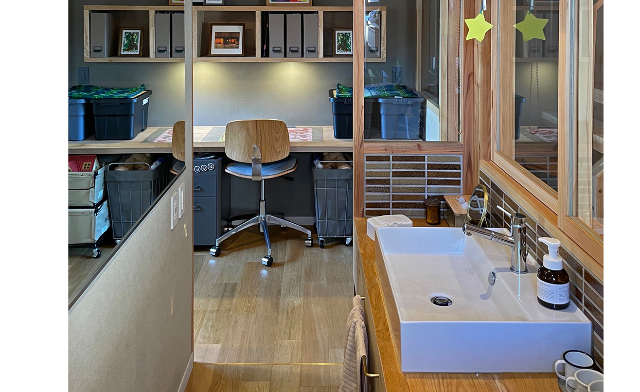 「狭くて暗い」というトイレの概念を捨て、2畳ほどの広さを取り、リラックスコーナーの中にトイレが付いているような感覚でデザインをしました。トイレ横が野外の吹き抜けになっているため、大きな窓にはブラインドやカーテンは不要。光をいっぱい取り込むトイレの窓横にスツールを置いてのんびり過ごすこともできます。