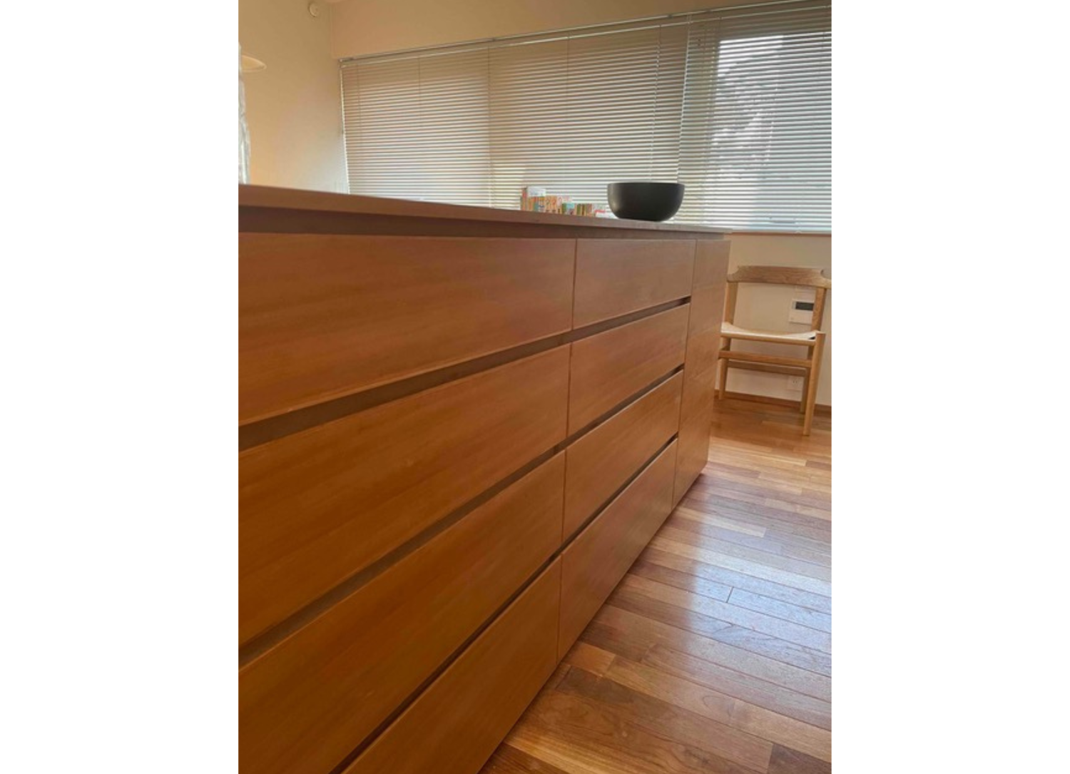 今後生活スタイルが変わったときにも柔軟に対応しやすいように、敢えて大らかな扉割にしていますが、引き出し内には無印良品の整理ボックスがきっちり収まるよう計算し、1段1段の内寸をミリ単位までこだわって決定しています。また、この収納がキッチンとダイニングの間にあることで、空間に緩やかな仕切りができます。