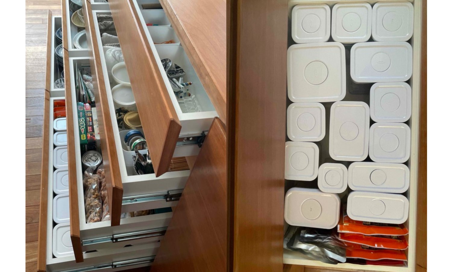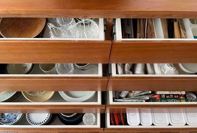 この住宅では専用パントリーをつくるスペースの余裕がなかったため、その代わりになる全長2メートル、奥行き42センチの食器棚兼食品庫を造作しました。 2列4段の引出しと、一部開き戸収納という構成になっています。
