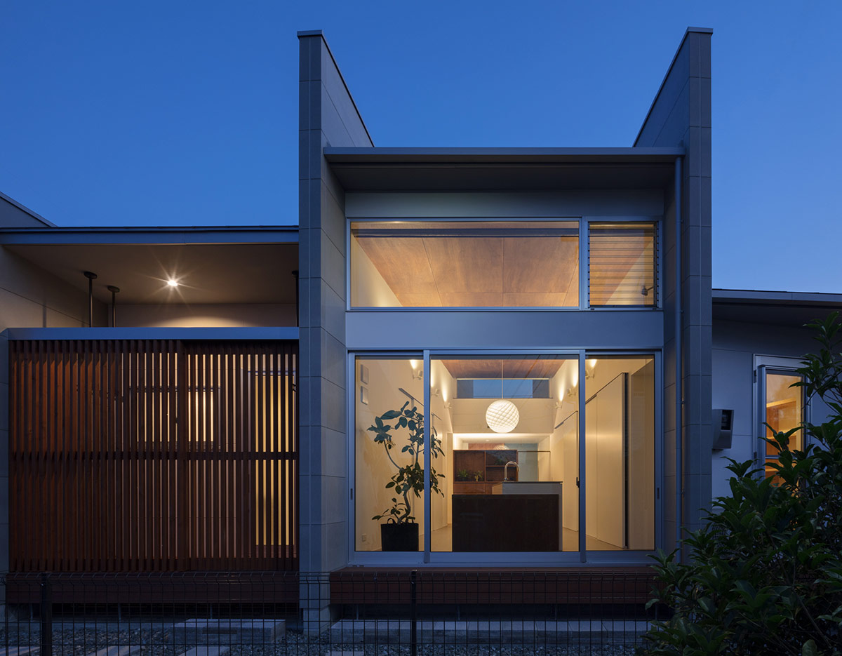 キッチンダイニングスペースが中心の、家族4人のための平屋住宅。