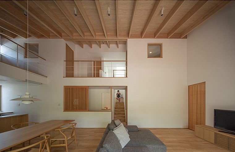 天井を切り込んで間接照明を設置し、背面と側面に大谷石を使用しました。大谷石は歴史ある国産石材で、旧帝国ホテルなどにも使用されているので、家具や住宅全体の雰囲気にとてもよく合うと考え採用しました。質感が濃い、かつ柔らかい石なので、住宅ではポイント遣いがおすすめです。思い切りが必要なかなり贅沢なトイレではありますが、毎日使う場所であり、空間や生活を格上げしてくれるので、条件が合う方には参考にして頂ければと思います。