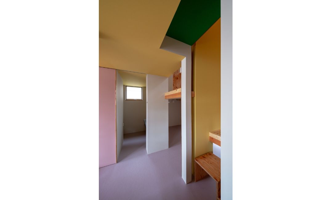この建物は南側はとても開放的で明るいのですが、北側には擁壁があり、暗くなりがちな立地条件でした。そこで家の奥側である北側を明るく楽しい空間にするため、家の奥に行くほど強く個性的な色を採用しました。光が射すと手前の空間と奥の空間の色が影響しあい混ざって、色が先行して変化して次の部屋と繋がっていくように作っています。トイレや浴室も断絶せず、この家の楽しい色の空間として溶け込んでいます。