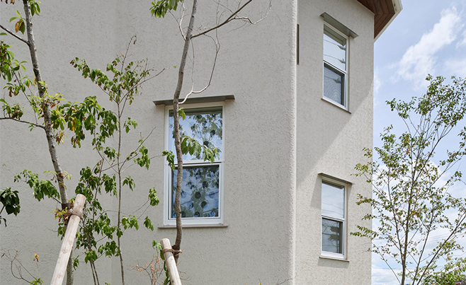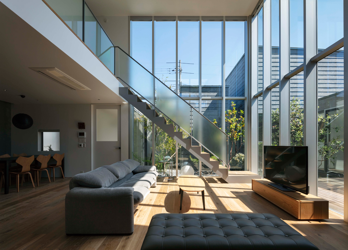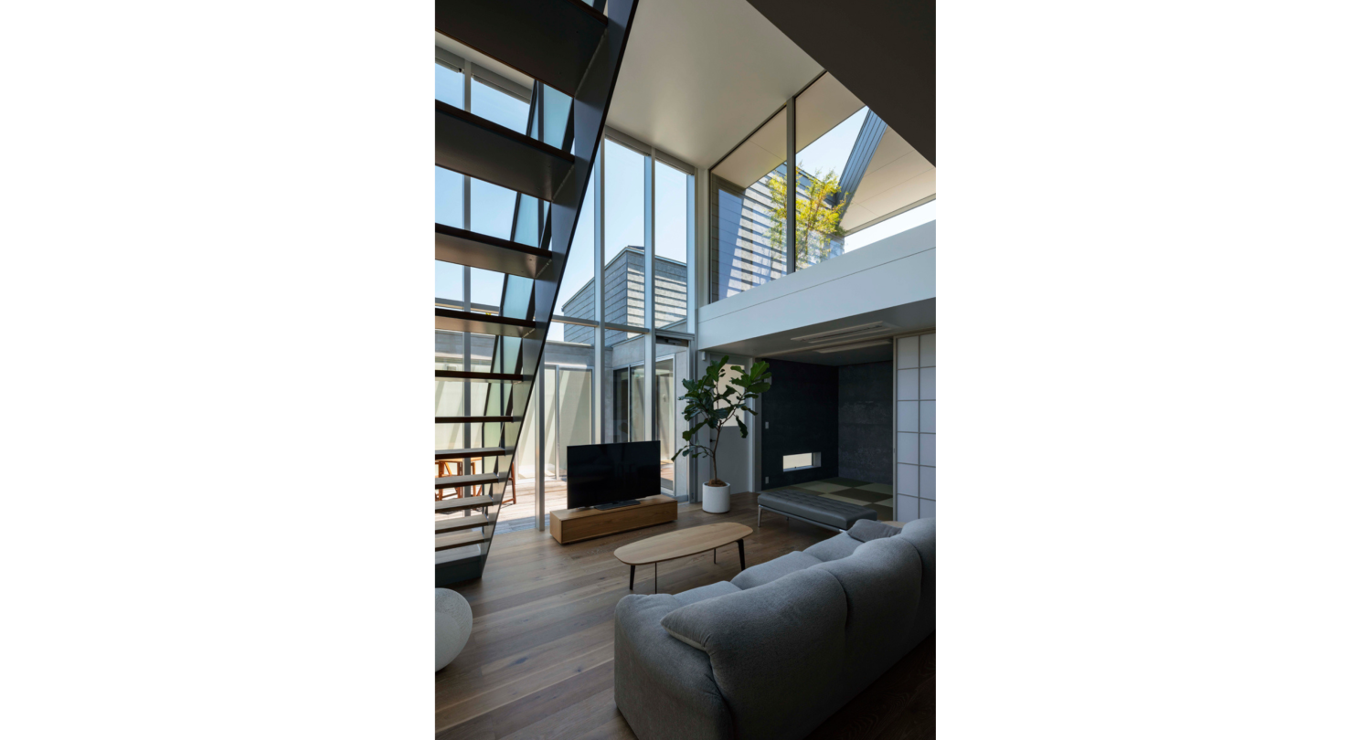 また、中庭のウッドデッキと植栽の部分をL字型に配置することで、室内外に一体感を持たせ、中庭を含む広がりのあるリビングとなりました。これに合わせて、サッシもL字型に配置。ビル用のサッシを採用することで、高さ5.25メートルの大きな窓が実現できました。