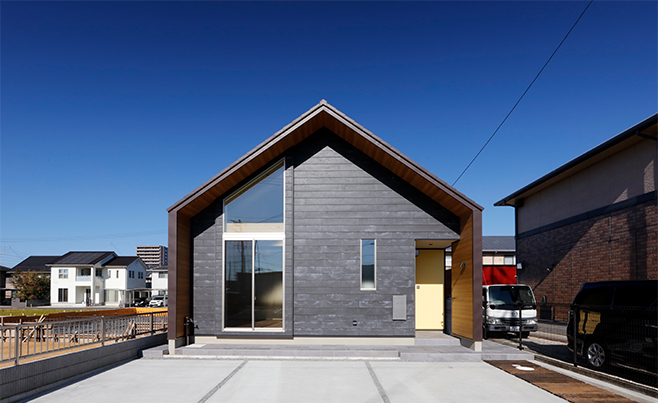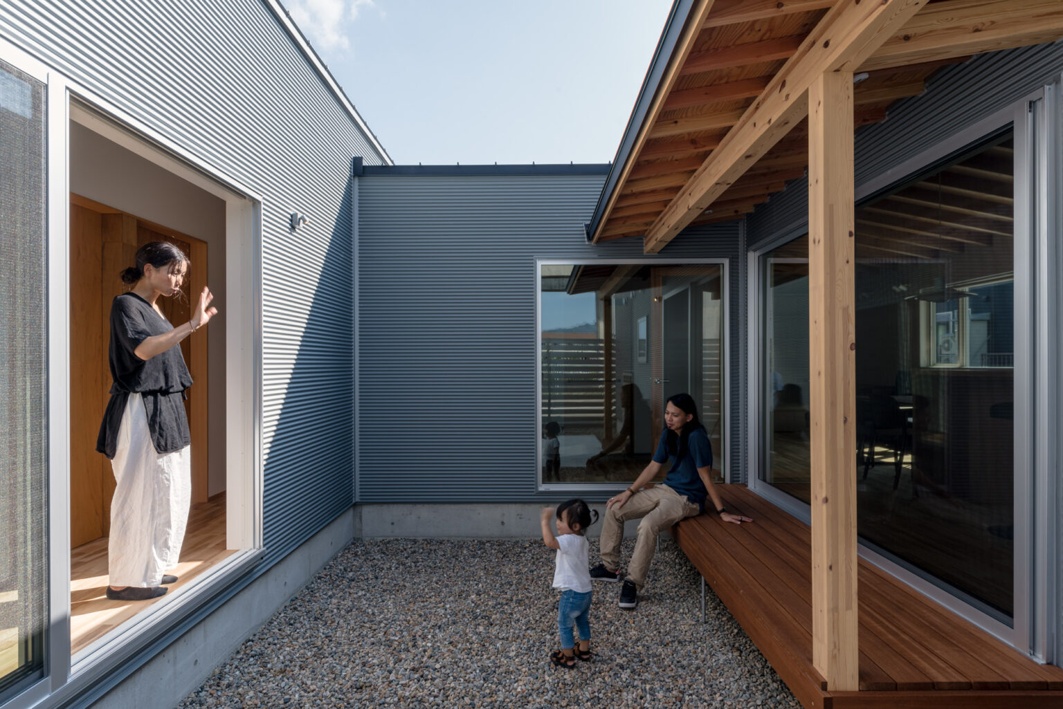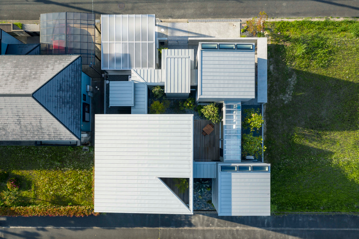 こちらの住宅は、各棟からそれらをつなぐ回廊まで全てを正方形に設計しています。このアプローチにより、縦横が均等になり、視界に広がりが生まれる効果を追求しています。リビングの面積はそれほど広くないものの、この手法により、広がりと開放感を感じさせることができます。