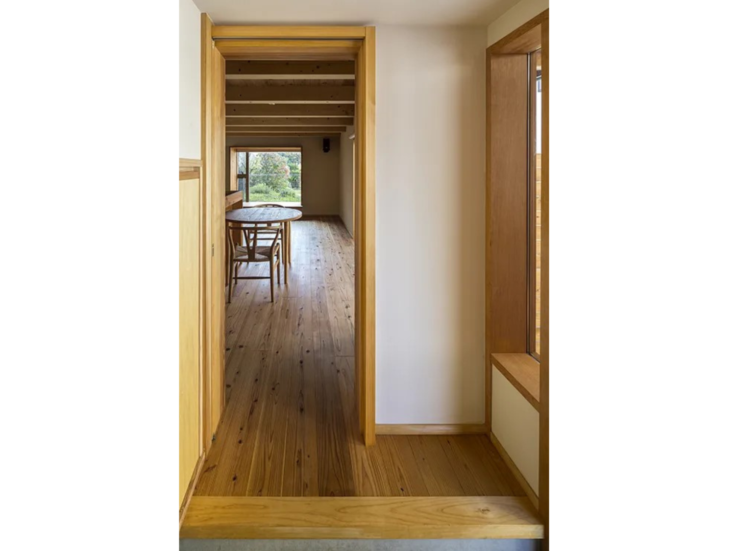 玄関から入るとすぐに現れるLDKは約14帖。この大きな出窓が外の景色に視線を誘導することで、空間を広く感じさせます。天井と床には杉の厚板を採用し、テーブルや棚も造作することで統一感を持たせました。壁には白壁を採用。素材選びと窓の配置により、狭さを感じさせないデザインが施されています。