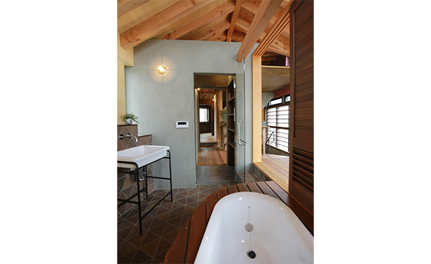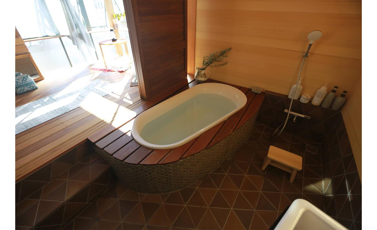また、浴槽の縁も木を張ることでテラスとの一体感を出し、テラスとして使う時に使い勝手がいいように洗面台をバスルーム内に置きました。