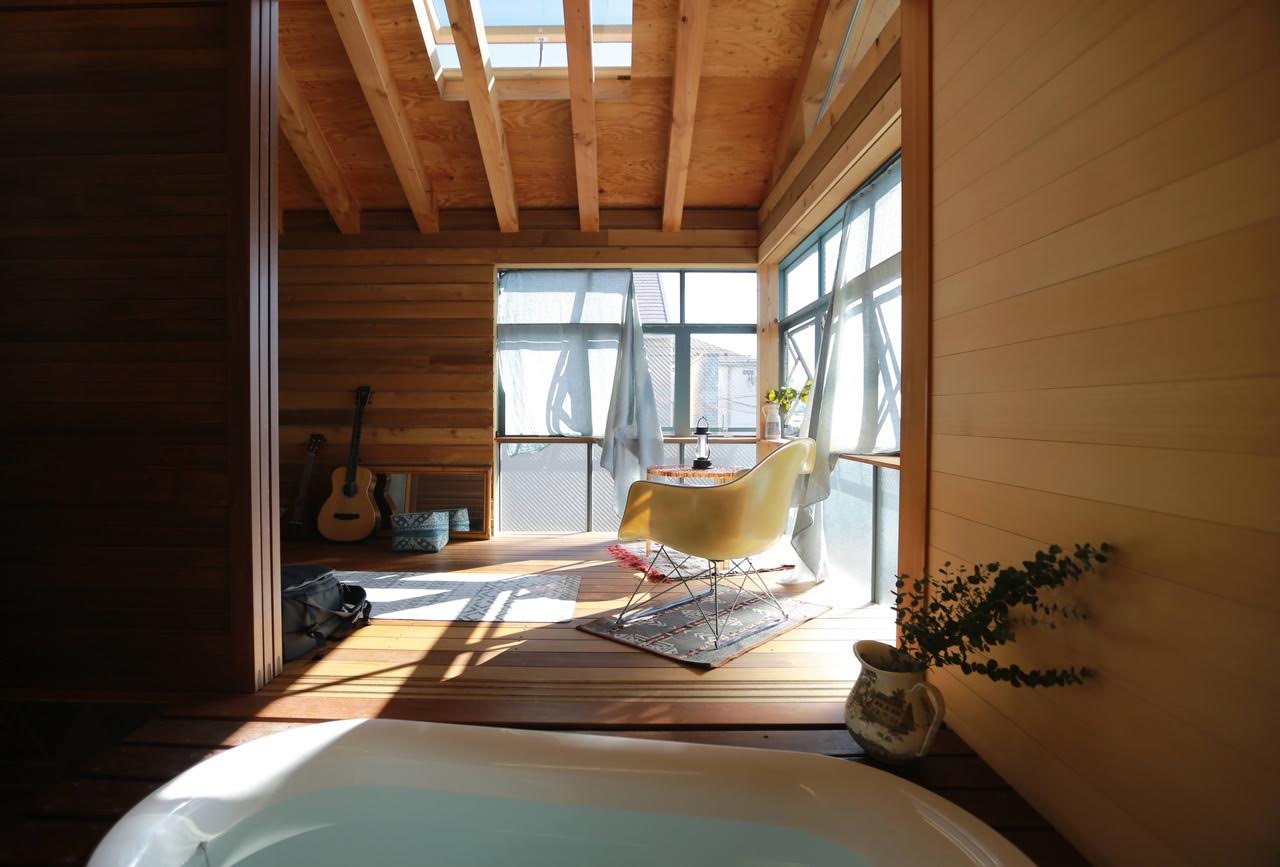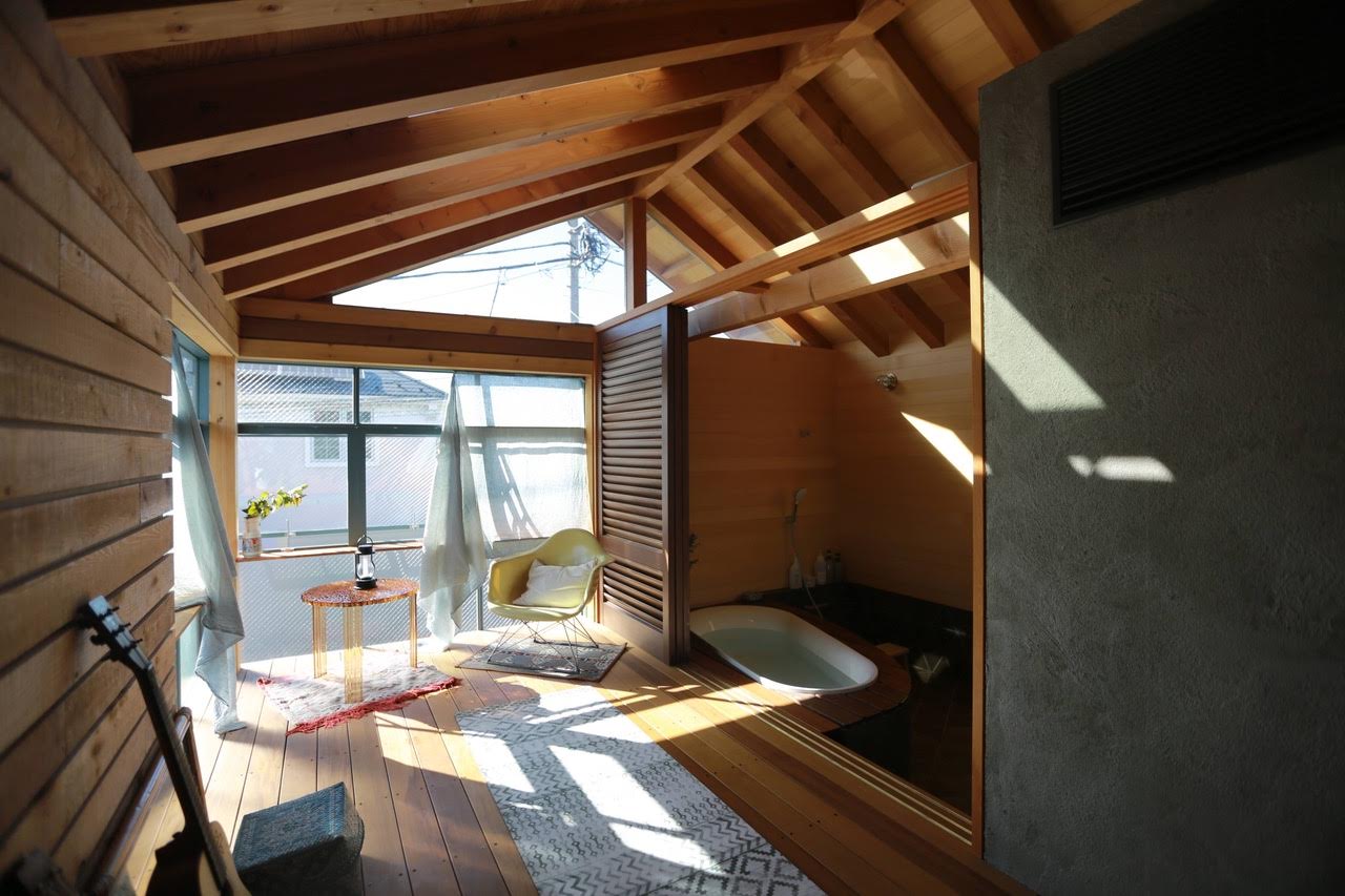 テラスと浴室はスライド式のウッドシャッターで仕切り、使うシチュエーションによって開閉できるように。