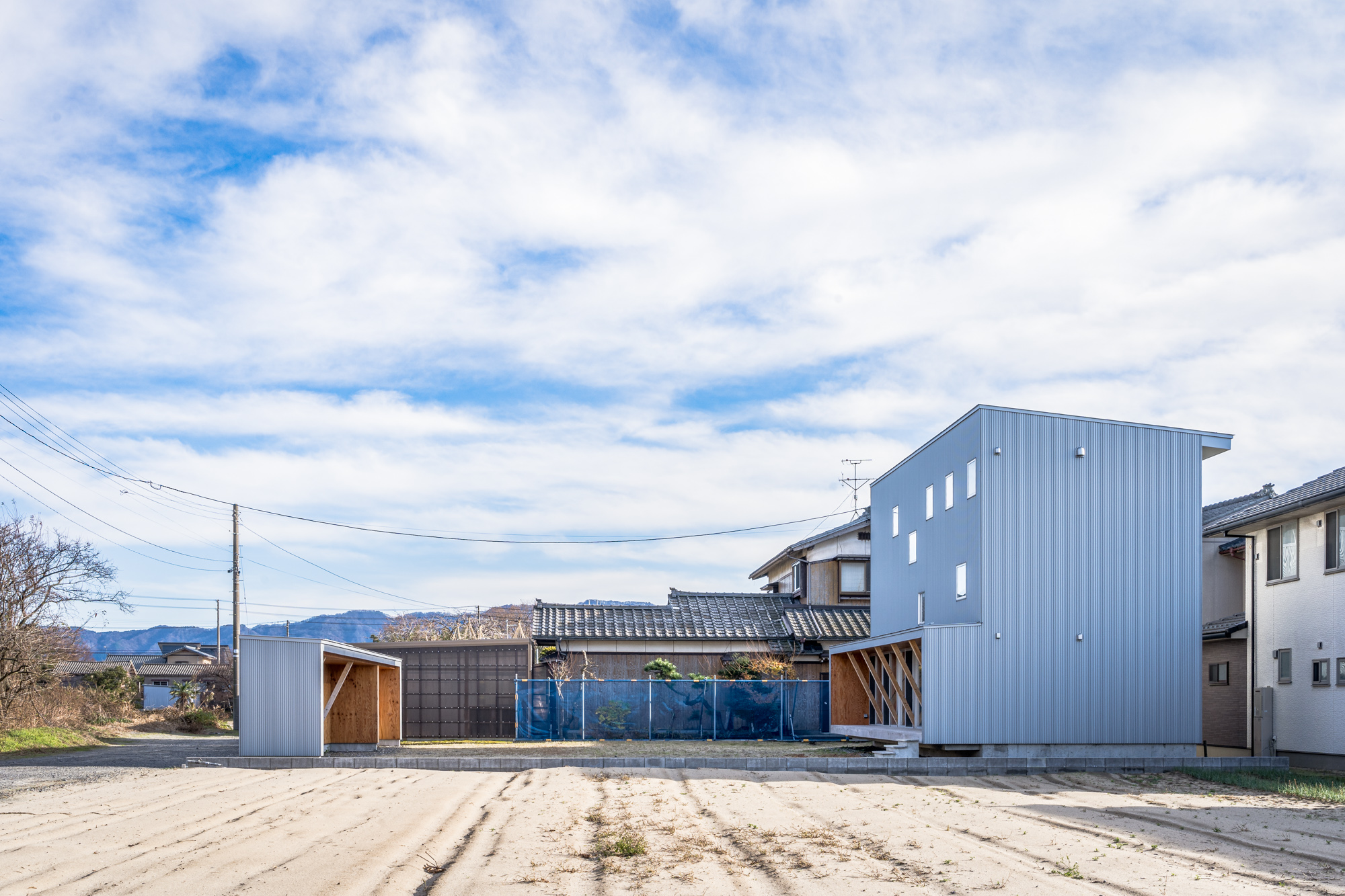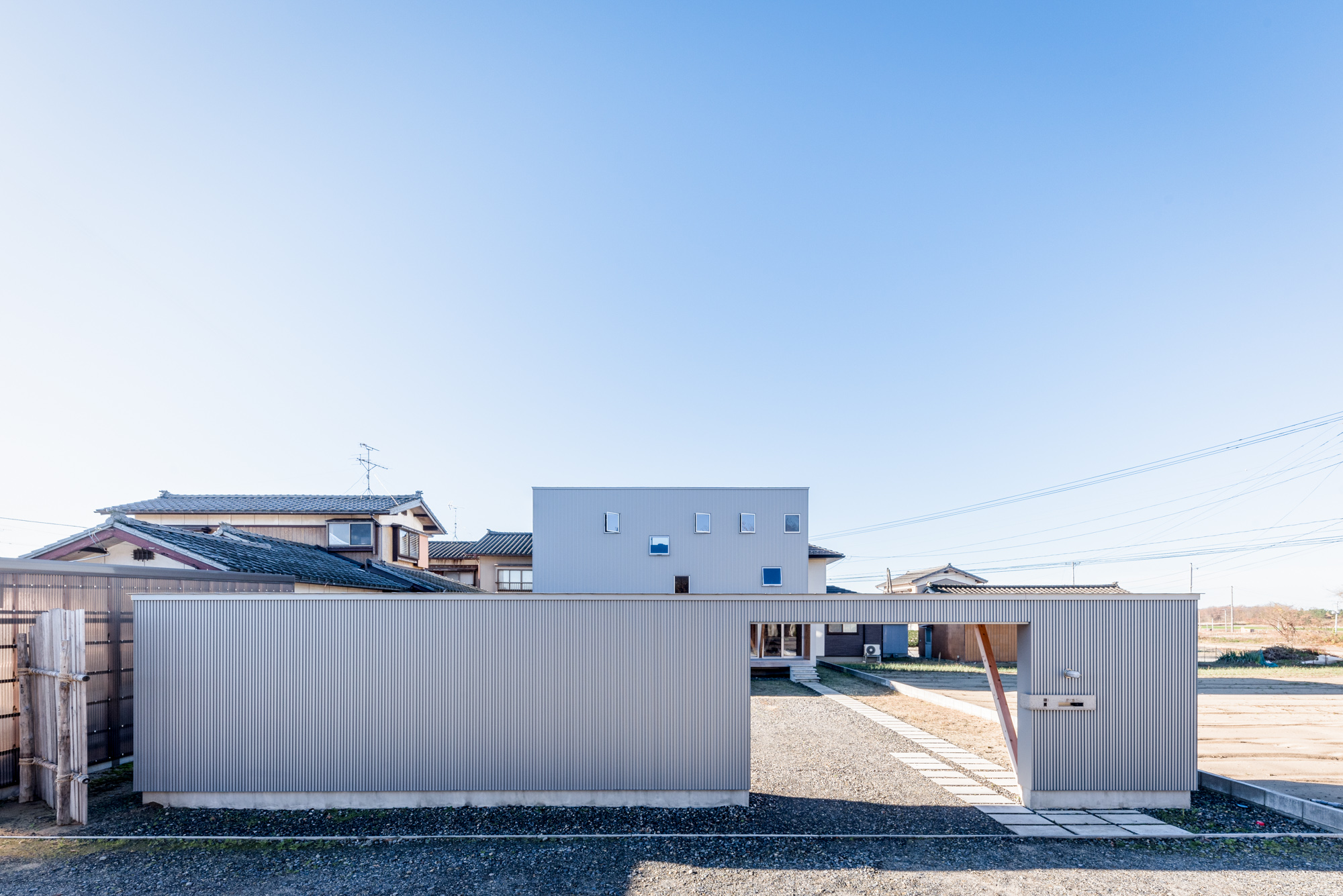 畑に囲まれているために明確な境界がなく、風雨や視線に晒される広大な敷地に対応するために、敷地の両端に玄関棟と住居棟の二つの建物を配置。敷地を挟むように配置することで、土地を有効に活用しました。これにより、二つの棟の間には大きな遊び場やスポーツを楽しむ場、家族が自由に過ごす庭が生まれました。