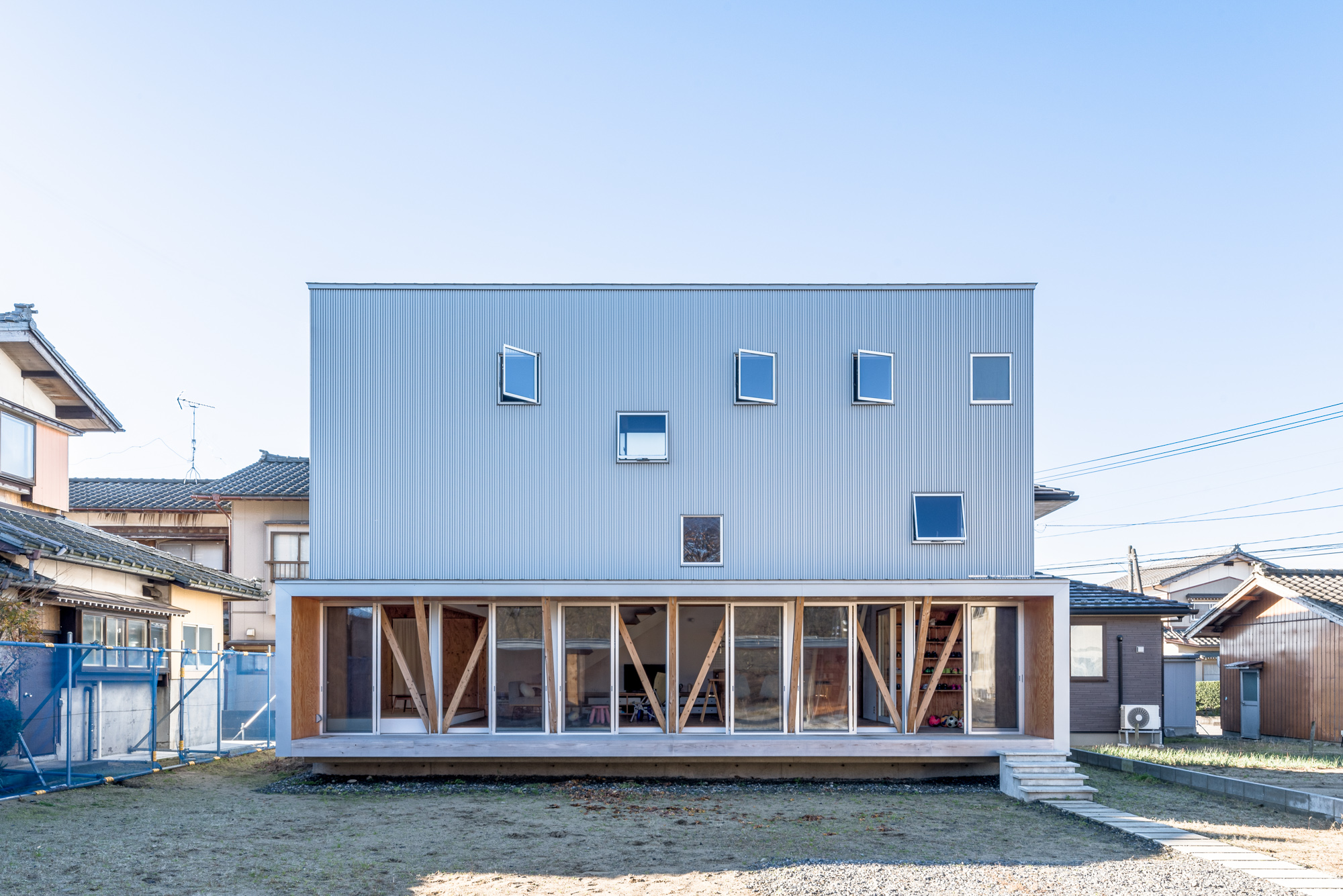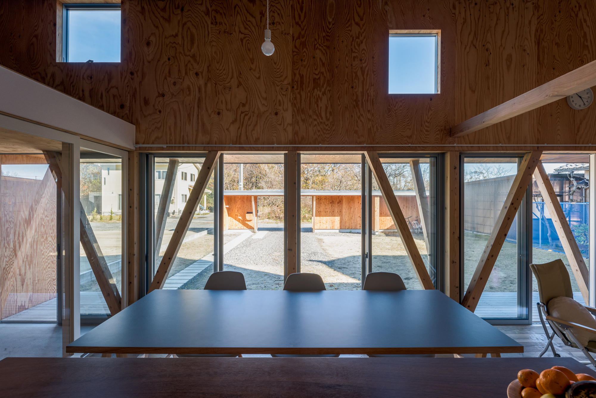 玄関棟はテニスの壁打ちやサッカーのゴールとして使われ、庇下はアクティビティを支える道具置き場としても機能。居住棟から見ると、玄関棟は小さな住居棟を拡張したようにも見え、視覚的な広がりと心理的な安心感をもたらしてくれます。