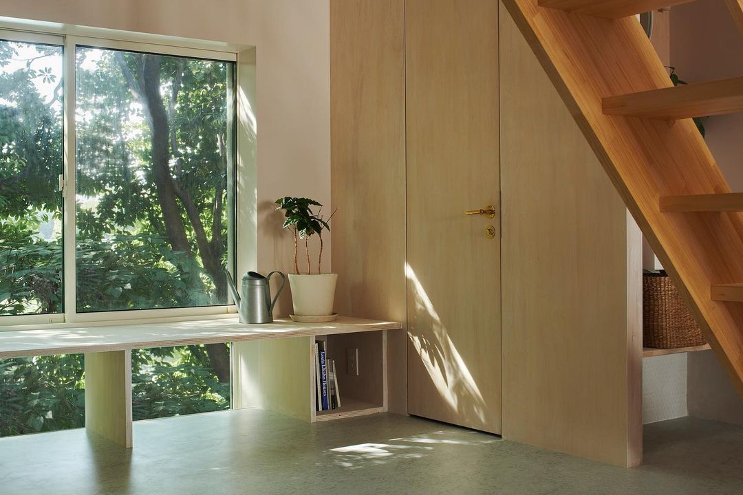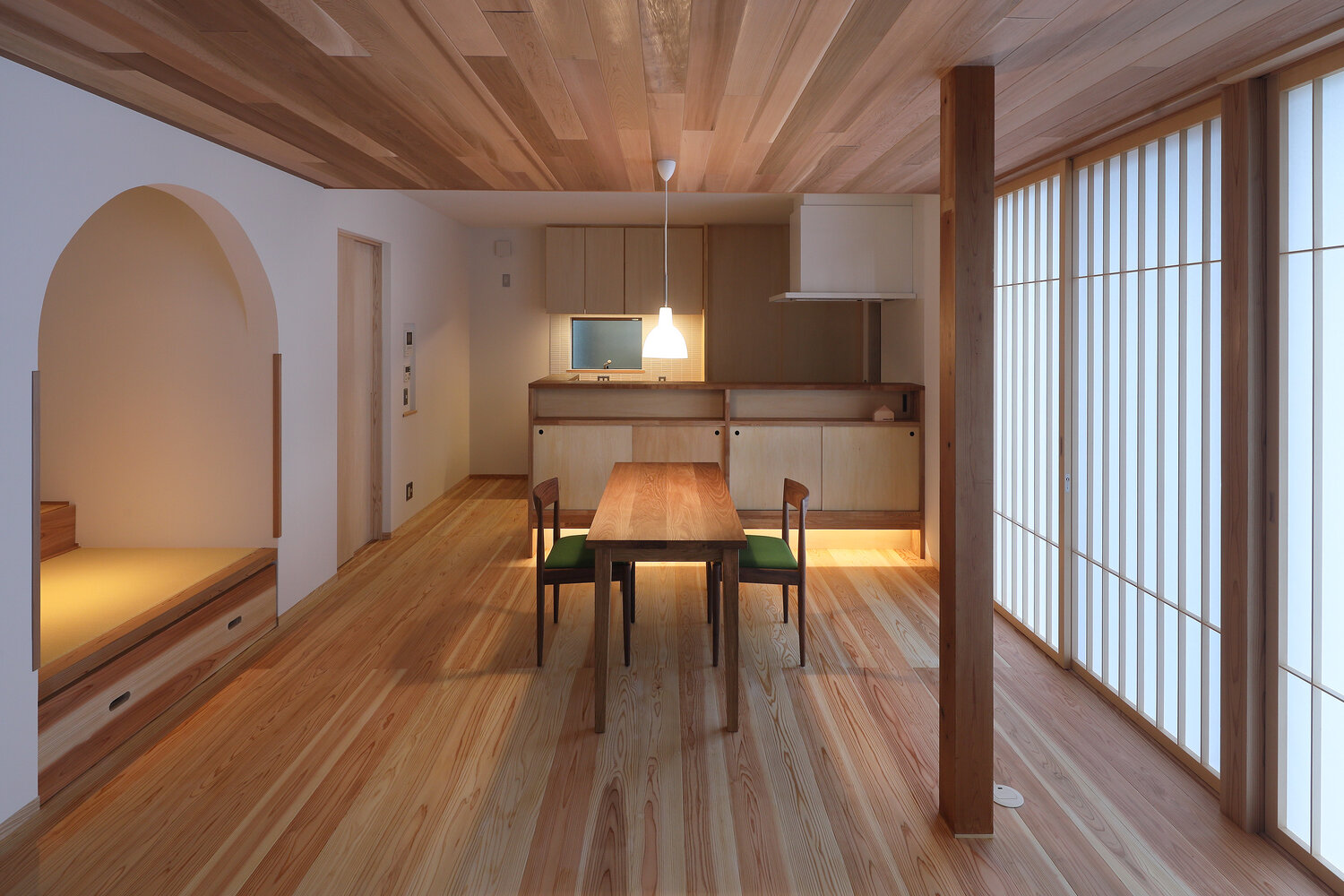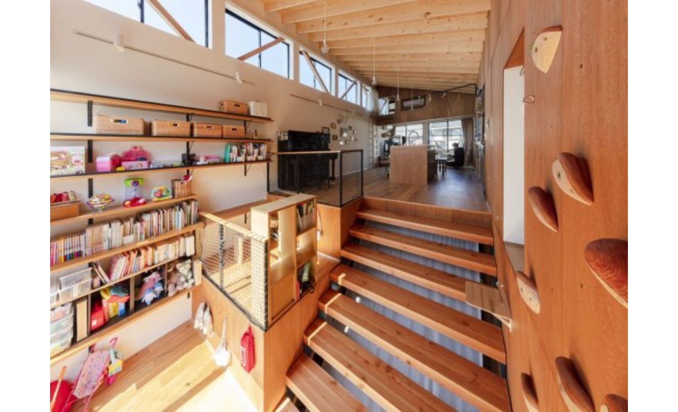 そこでトイレを下のフロアにも設置し、大きなワンルームとなっている2階のLDKからそのままトイレに入る配置となりました。部屋の中でトイレの存在が主張するのは気持ちがよくないと考え、生まれたのがこの工夫です。写真1枚目のように、ドアと左右の壁部分の木材を等間隔に割り付け、天井部分まではふさがない形にして、一見ドアとは感じないようにデザインしました。合板仕上げの扉で、トイレスペースの垂れ壁部分にかぶさるので壁部分とドアが同じ見え方になります。