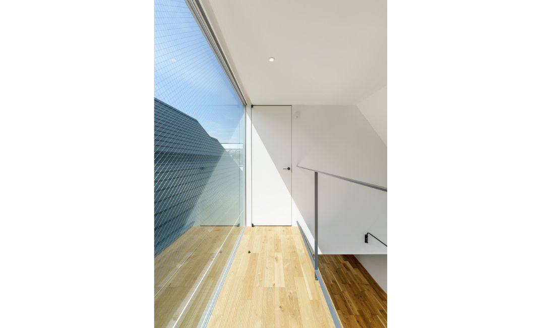 大きな南側の最上部の窓から採った光が吹き抜けからフロアに降り注ぎ、さらにそのフロアから北側へ向けて設けた下階へつながる吹き抜けを通って玄関まで届きます。これにより家の中のどこにいても外の変化を感じることができます。