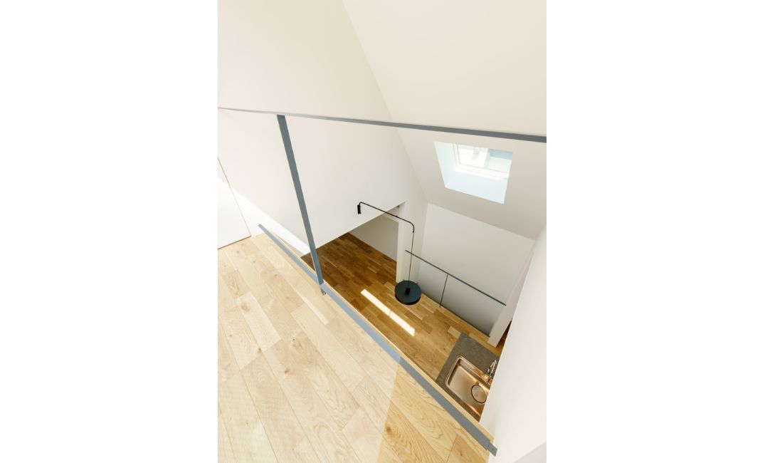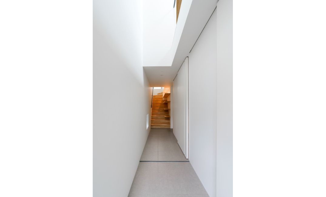 玄関は北側にあるのですが、どうしても暗く閉じた形になりがちなのを解決するためにも、家の南北をつらぬく斜めの吹き抜けを設けました。