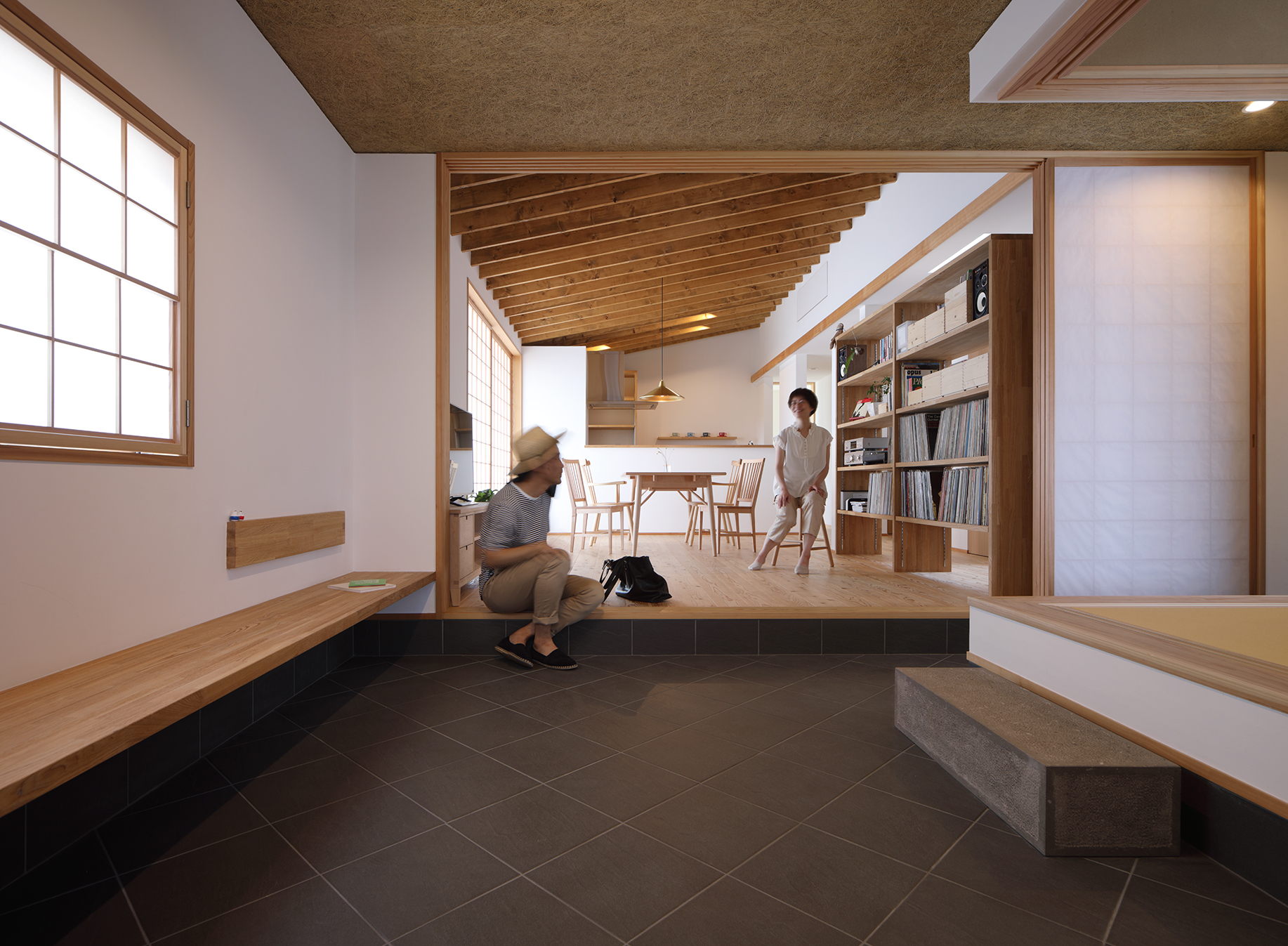 土間部分には腰掛けて靴をはいたり、荷物をおいたりできるようなベンチも設けているので、ご近所の方などの簡単な来客対応も可能です。他にも、例えばベビーカーや買い物の大荷物があるときもそのまま入ってこられるなどの利点があり、様々なシーンで多様な使い方ができるかと思います。