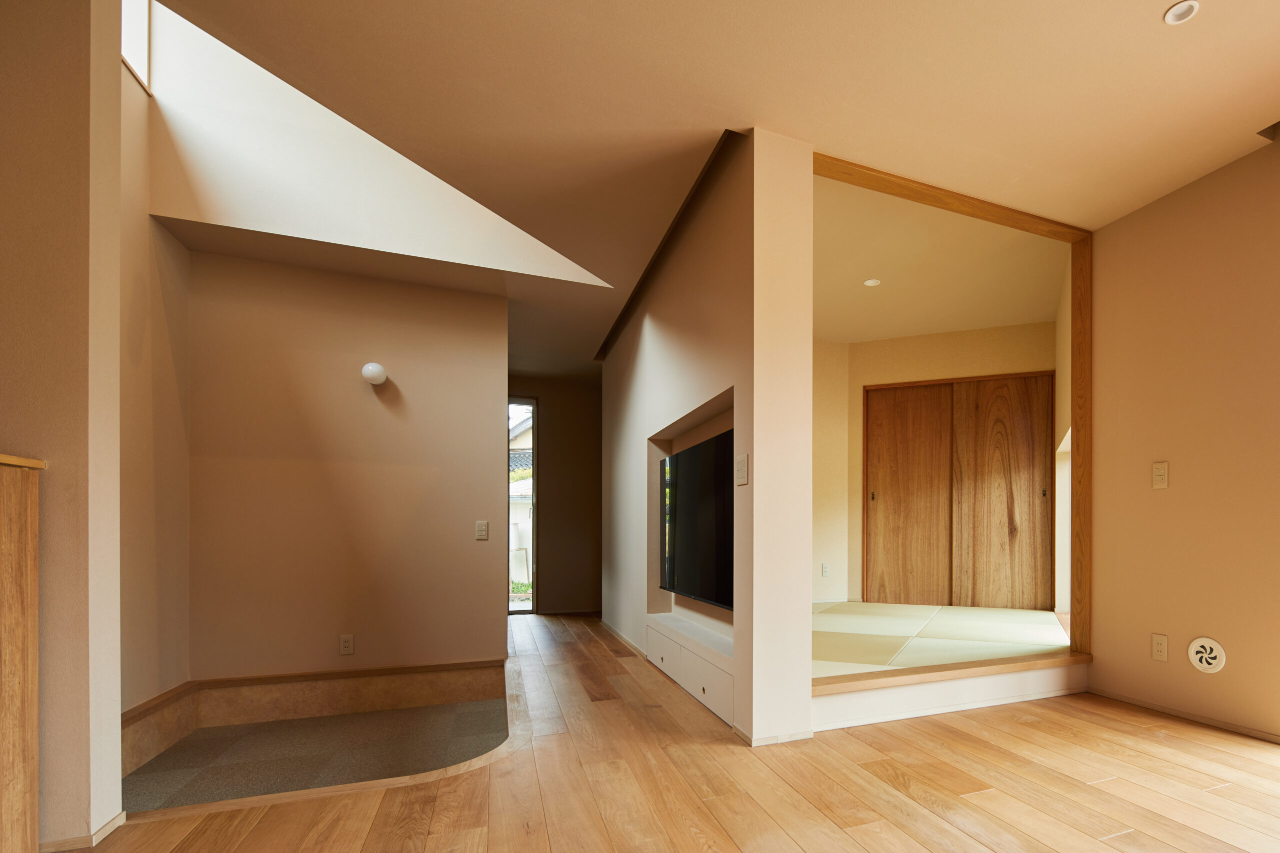 写真では色が2色に見えますが、これは畳の目の向きの違いでこのように見えるもので、同じ色の畳を使用しています。畳はい草ではなく和紙畳を採用しています。これは、い草の畳よりも薄くて軽いものなので、カットすることができます。それにより、ダイヤ模様の斜めの敷き方でも部屋の端も部屋の形に合わせて収めることができます。