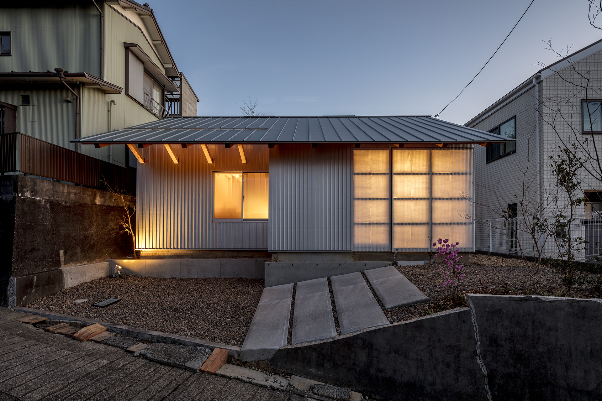 夜は半透明の玄関引戸が室内の明かりを透過し、外部の沿道を柔らかく照らし出します。