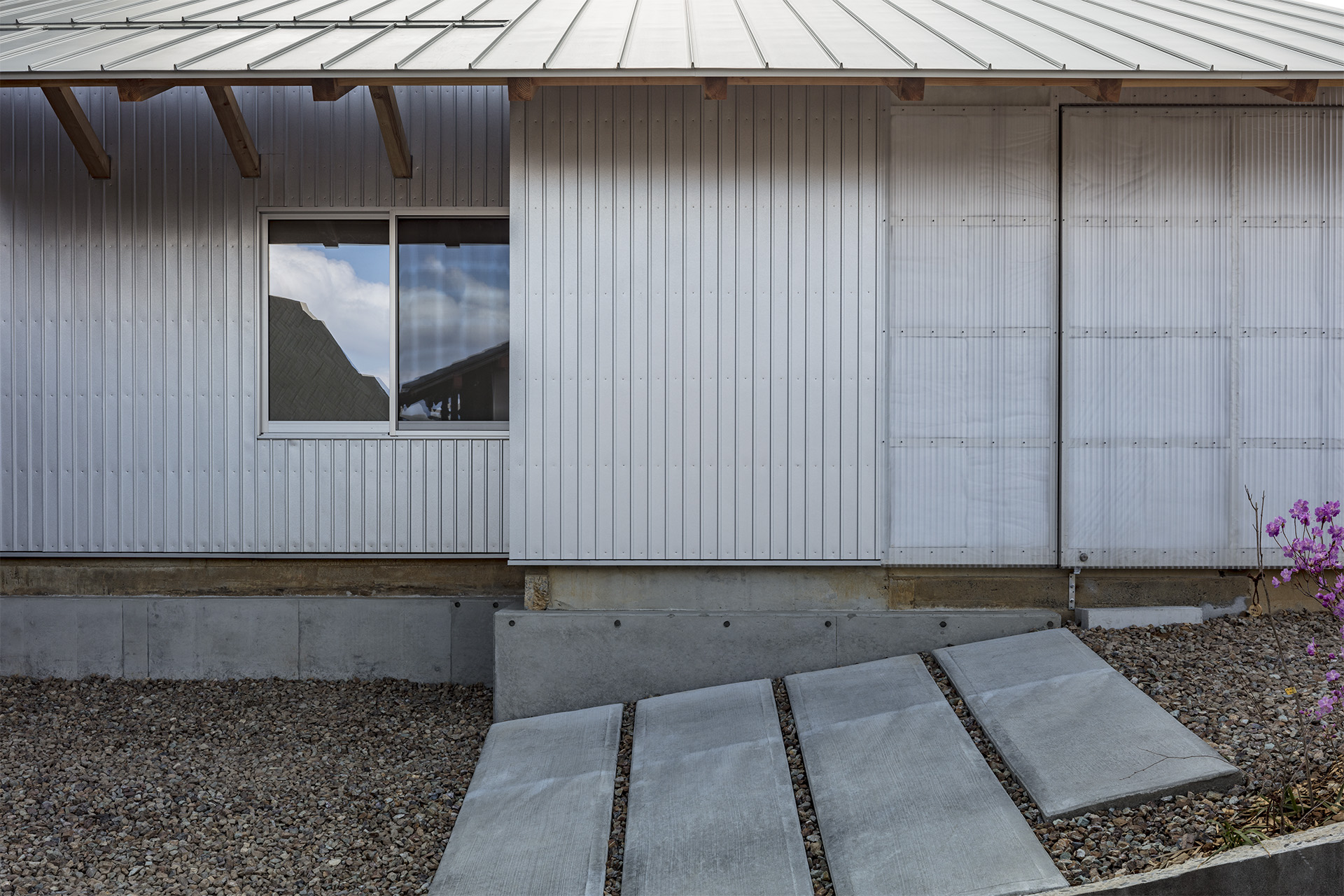 外装のポリカを、隣り合うガルバリウムとほとんど同面でおさめていることや、下から上まで1枚で開閉するようにしたことで、「開く壁」のような印象となるようにデザインしています。