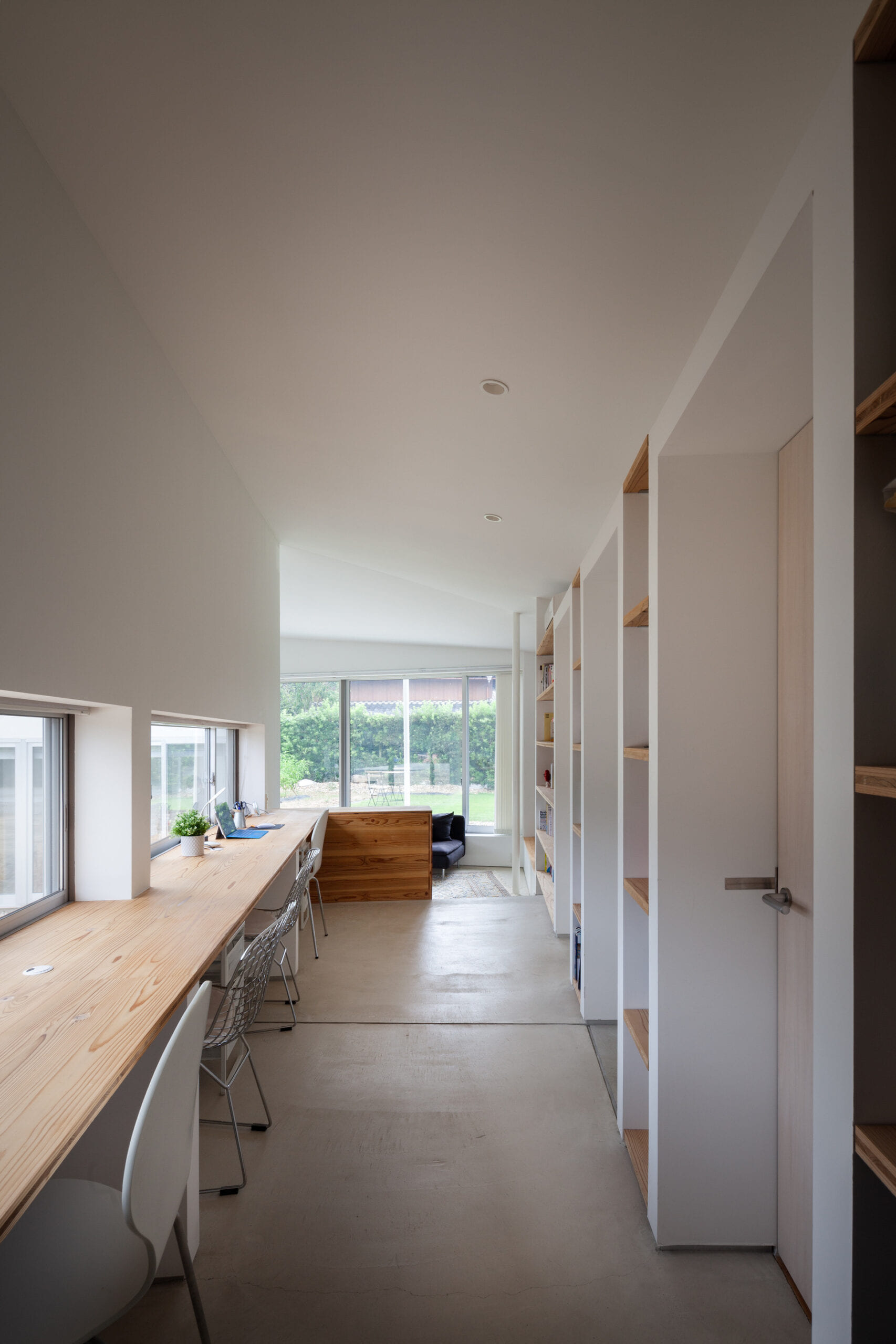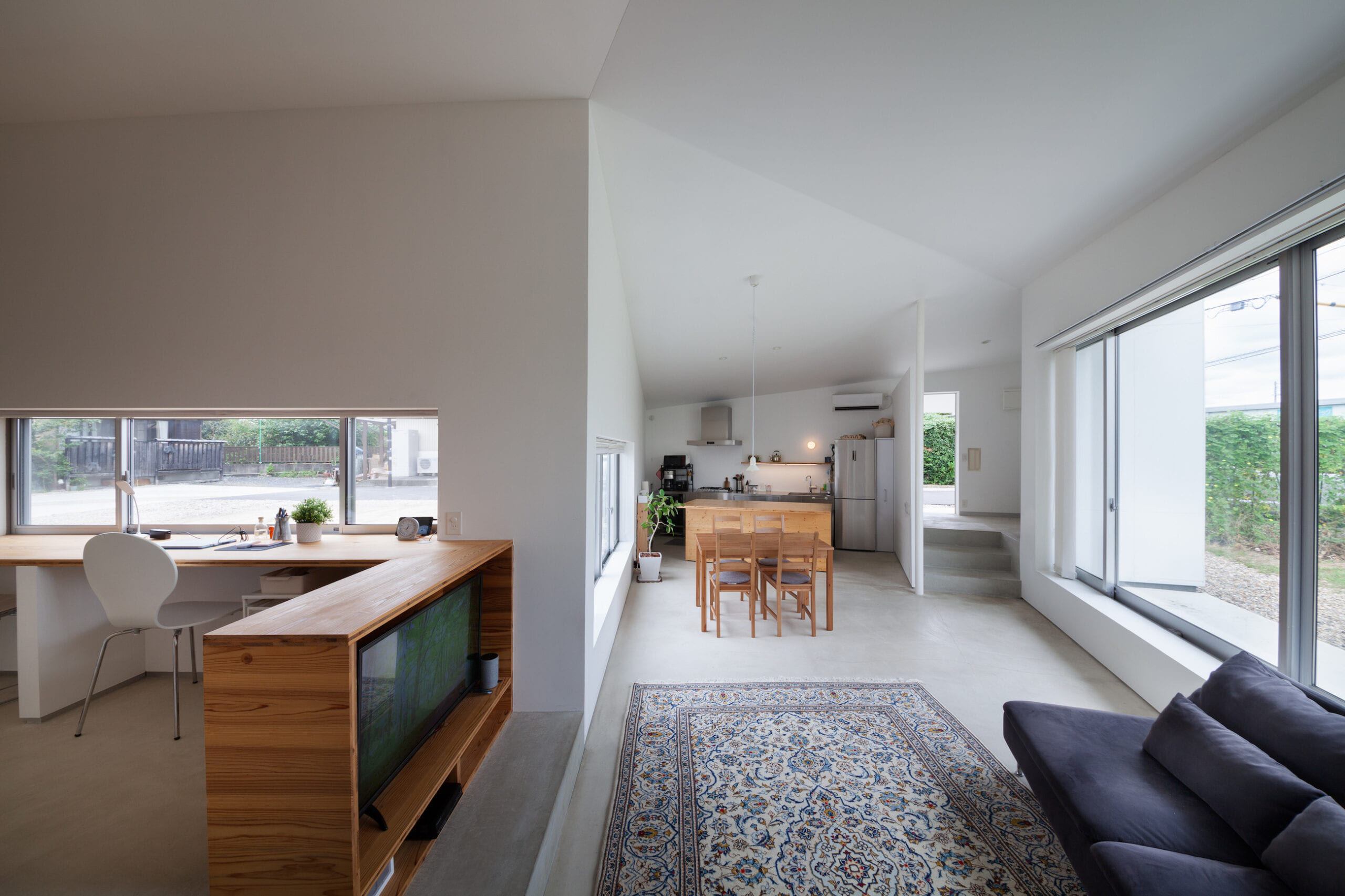 大きな平屋のこのお家。 仕切りは少なく、LDKは一つの空間に広々ととり、L字になったLDKの先は、テレビ台で緩やかに仕切った ワーキングスペースがあります。清潔感のある白を基調とし、アクセントに木の家具を置いています。