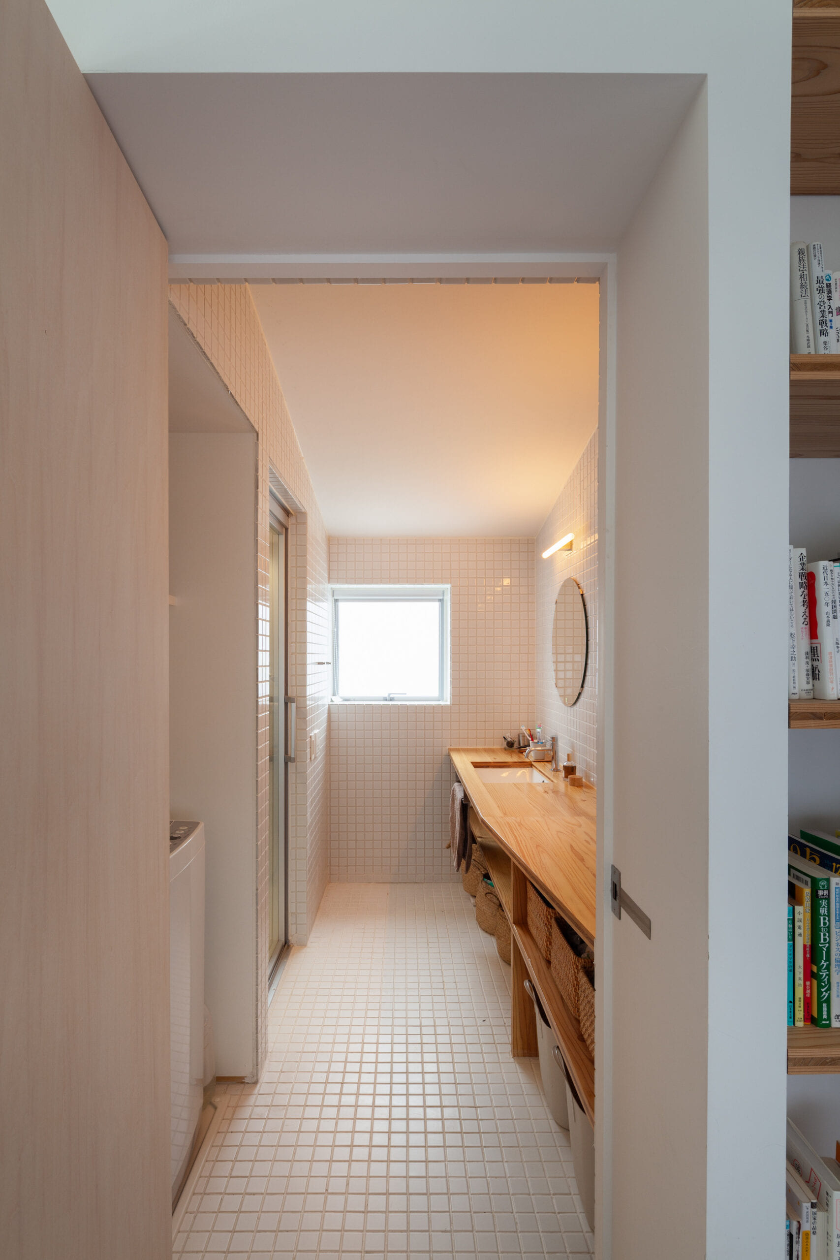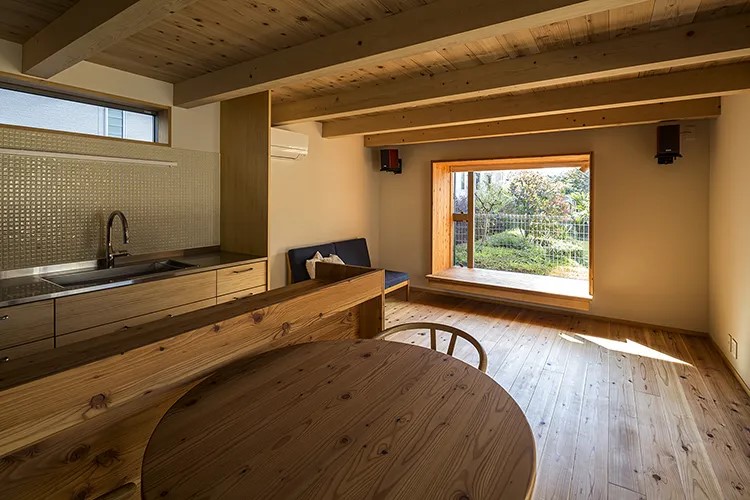 テレビ台や、ワークスペースのテーブル、洗面台などのアクセントで使用したのは、“Jパネル“という、柔らかく肌触りがいい杉を3層のパネルにした木材です。木目が綺麗で、肌触りも良く、これをアクセントに家のいくつかの場所で使うことで、家全体に統一感が出ます。