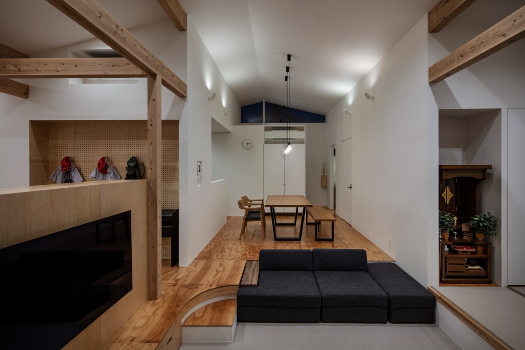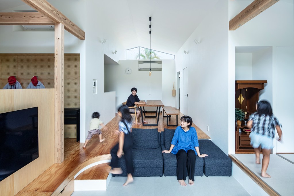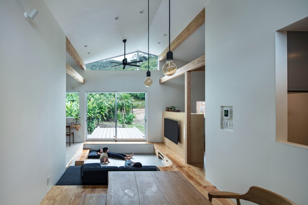 この建物以前にも『住倉』の2Fの床の一部も合板を荒く磨いた仕上げにしていました。ただ『奄美大島の家型』では、暮らしのメインとなるLDKの床で、まだ小さいお子さんもいらっしゃるという状況でしたので、ケガなどに繋がらないように、よりきめ細かく磨き、さらに塗装を4回程度塗り重ねました。施主の方も、サンプルなどは見ていましたが、完成まではドキドキしていた部分もあったようです。