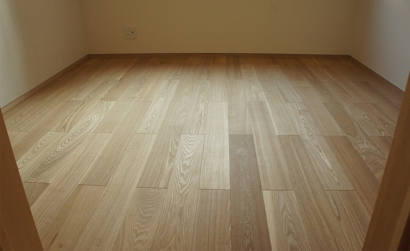 また、好みの別れる部分だと思いますが、節などの木の持つ模様が派手に出ますので、個性のある床面となります。耐久性などの部分では積層フローリングと大差なく、特別メンテナンスが難しいなどもありません。フローリングのようにサネ(つなぐ部分)がないので平らで、万が一将来的に、シート張りで雰囲気を変えたいとなったときも施工が可能です。