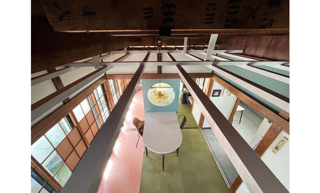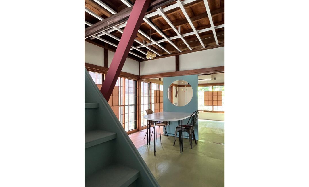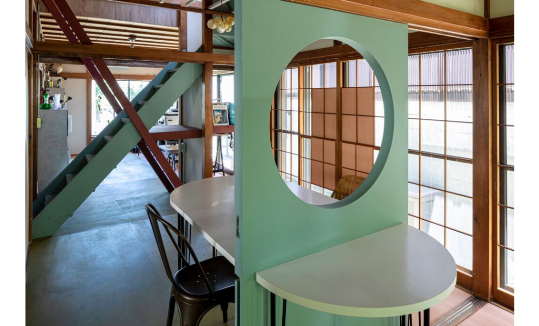 上部にくり抜いた丸窓が、空間だけでなく、元々の和の要素とプラスされたの洋の要素をつないでくれ、この家の象徴になっています。