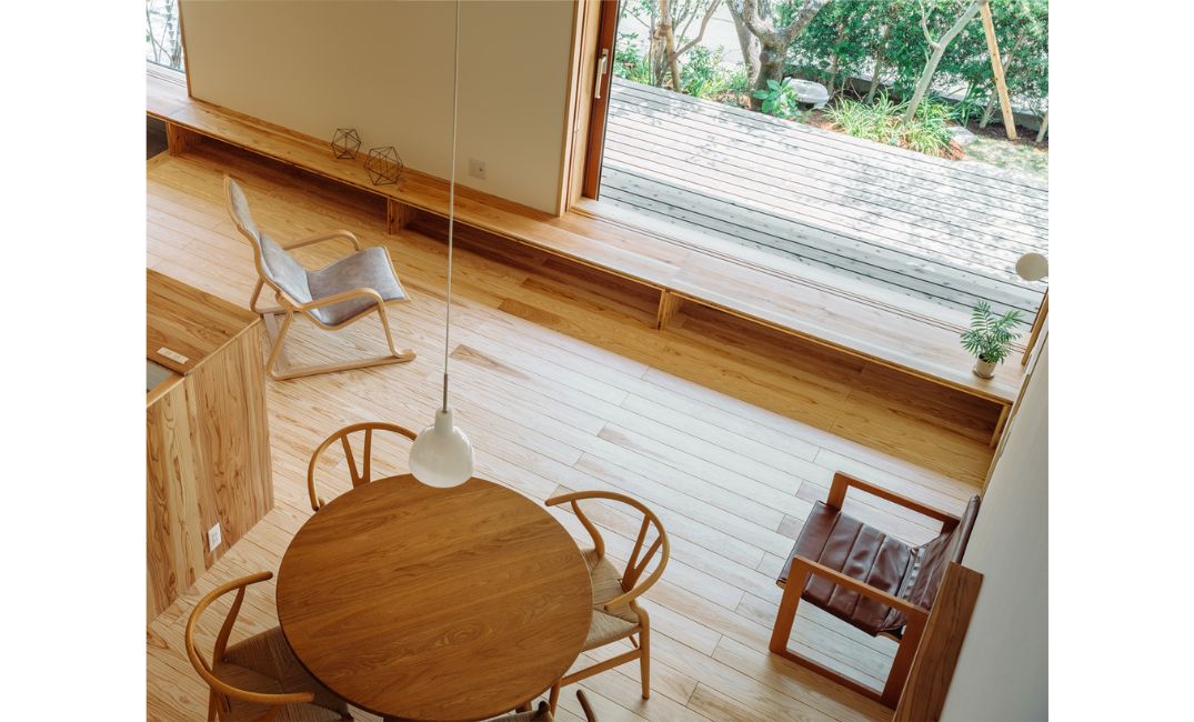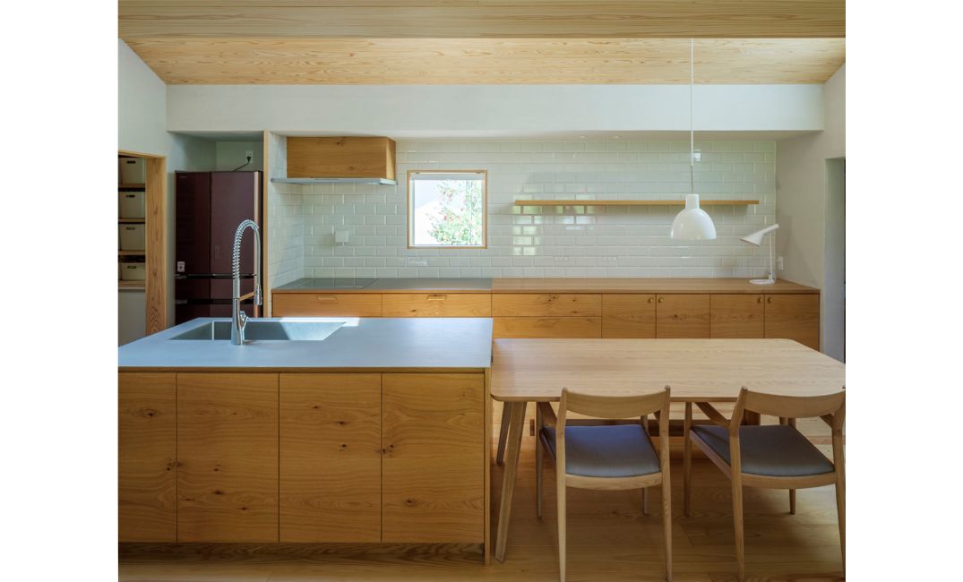 『浦志の家』は隣に両親の住む家があります。両親の家は家業を継がれているご主人の仕事場でもありました。食事時などに家に戻ることなどを考えて、不便ではない動線が望ましい環境です。また、施主のご家族には雨の日でも濡れずに車から降りたいというご要望がありました。その二つの条件を考えて、設計したのがこの大きな軒です。