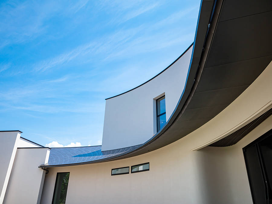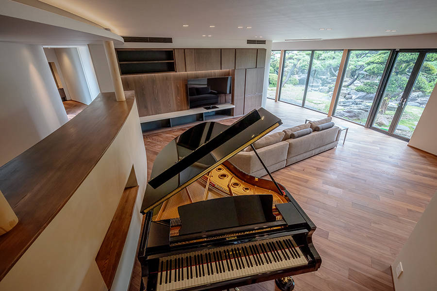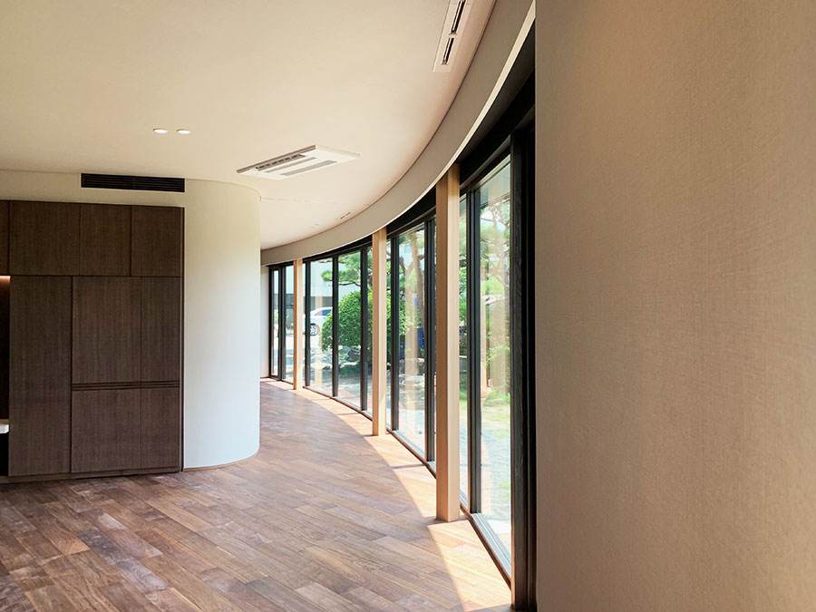 生活の中に庭の緑を取り込むために、庭に建てものを取り入れるようにデザイン。大きな開口部をラウンドさせることで、普段の生活の中で外と庭との関係を呼び込みました。