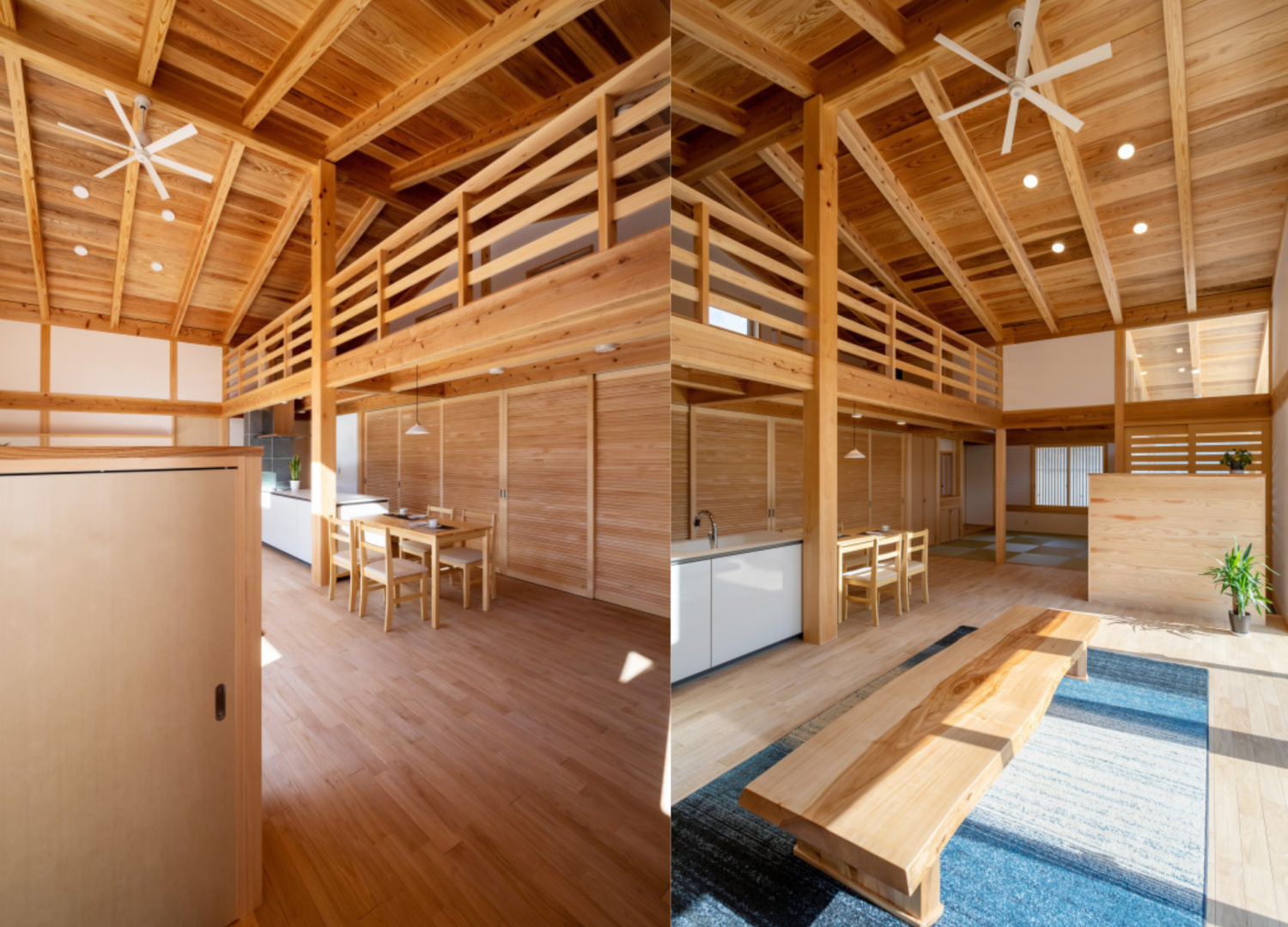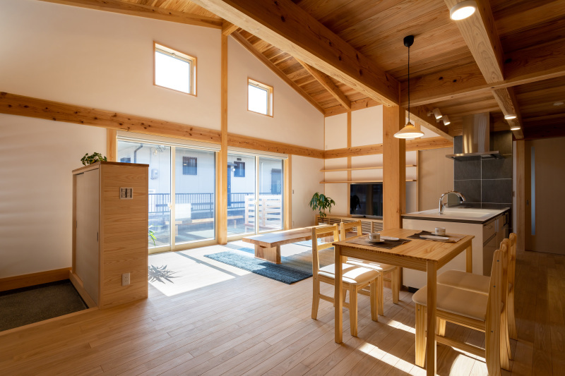 家の中央に広くとったLDKは、天井の構造材を活かし、屋根野地板をあらわにすることで、天井が高くなり空間が広くなります。また、天井や壁は配線が見えないよう工夫し、ダウンライト風のシーリングタイプの照明を採用することで、空間の広さが強調されます。