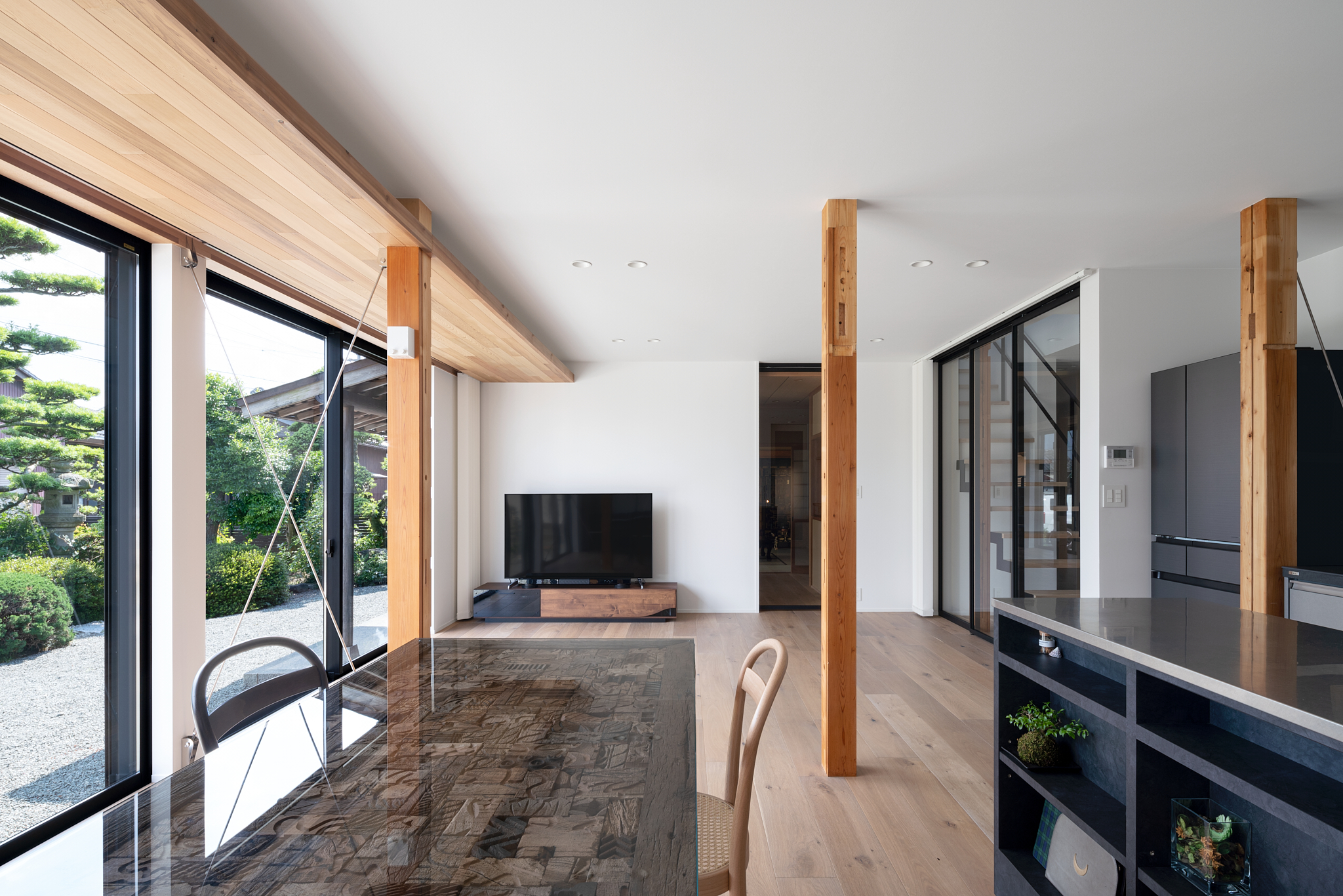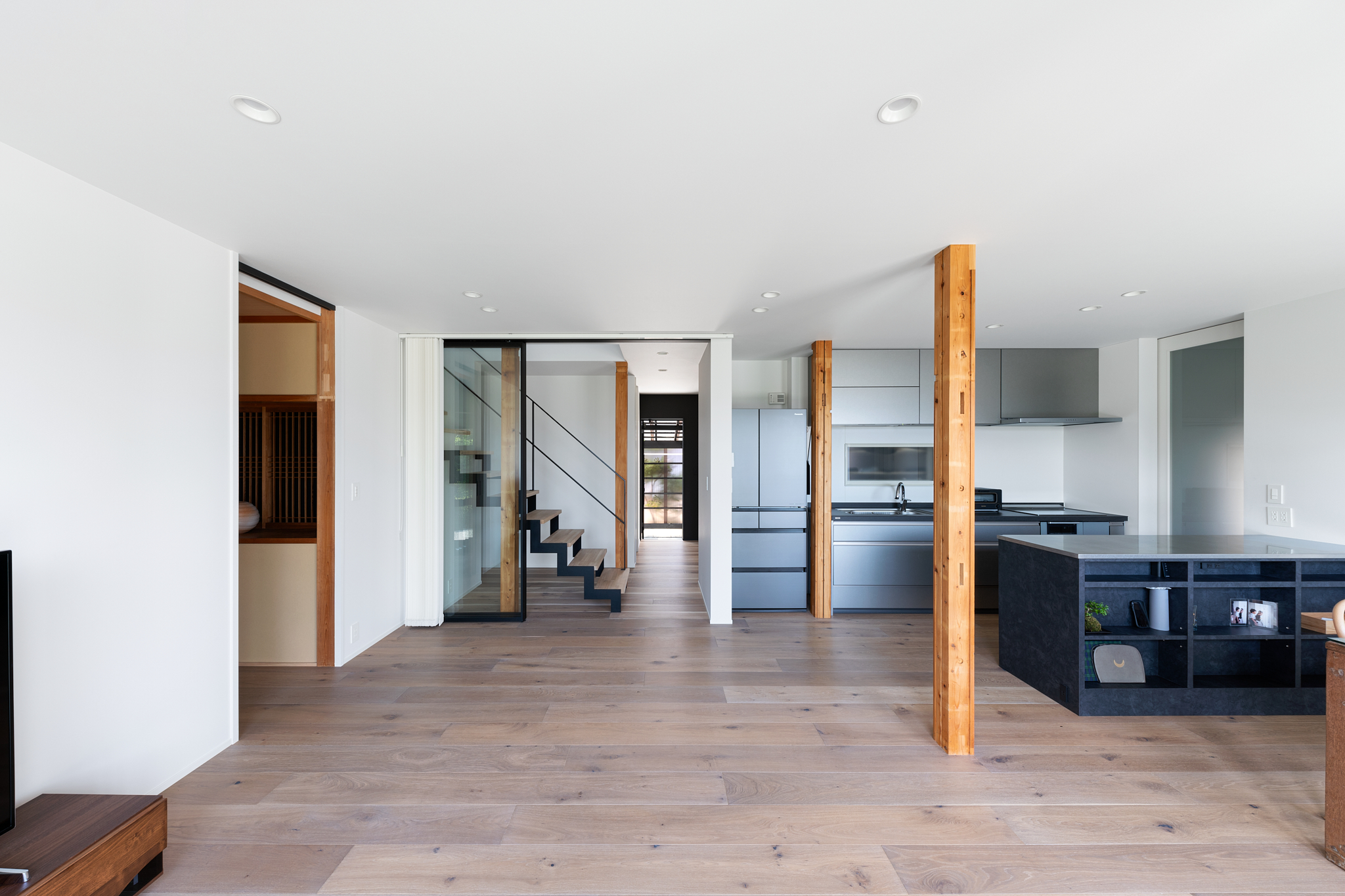 プロの住宅レシピ 和モダンリフォーム ガラス建具でLDKとつながるシースルー階段