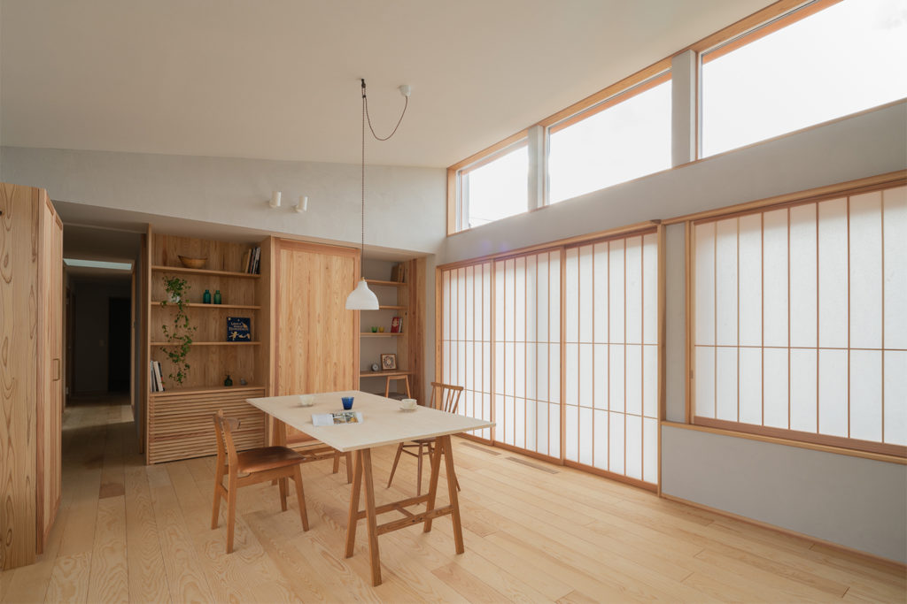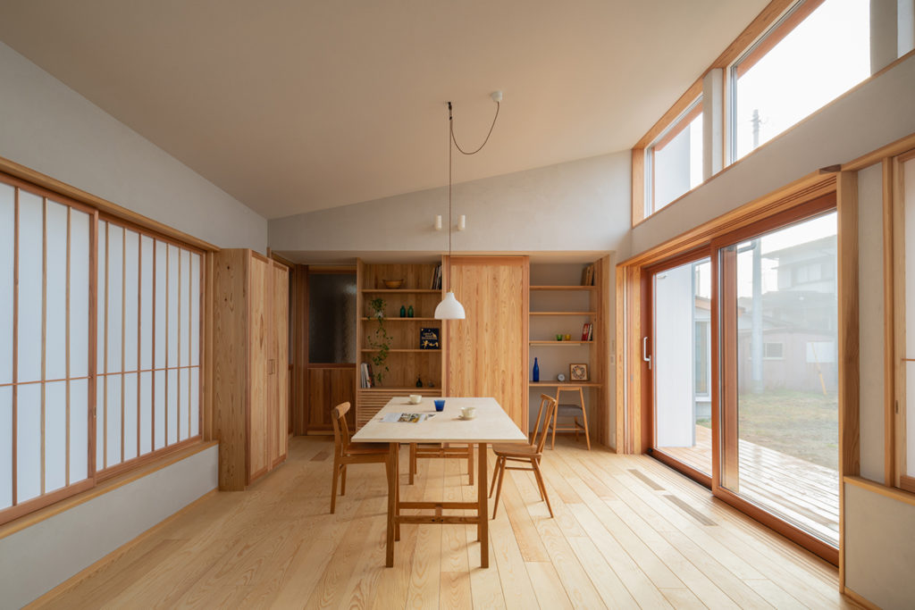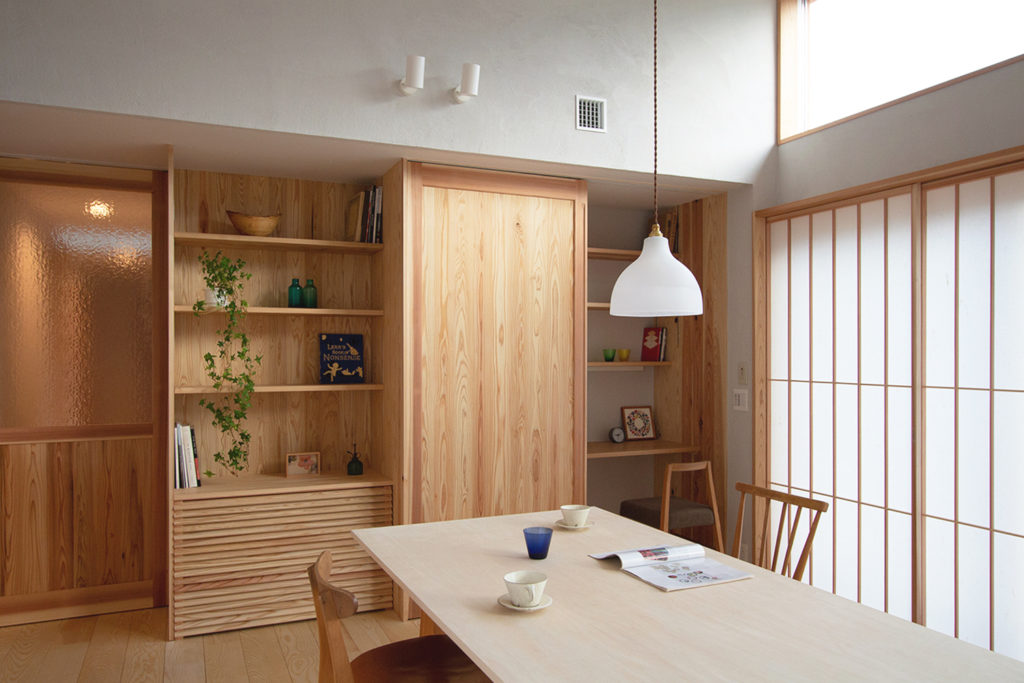 形はそれぞれの家族の暮らし方により様々ですが、『河口湖の家』ではリビングに「しまえる書斎」をつくりました。引き違い戸を開けると現れて、普段は飾り棚の一部のように開けておくこともできますし、閉じれば扉の中に隠れます。