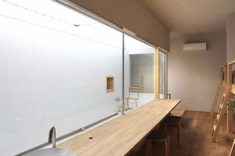こちらの子供部屋は、デスク、収納、寝室を分解しつつ、兄弟で空間を共有する設計です。デスク、廊下、寝室、収納を立体的にまとめました。ロフトのような小さく包まれる空間は、子供にとっても居心地がよかったりします。ロフトの下は大容量収納スペースとしています。そして、中庭に面して設置したデスクは、子供たちの勉強場所や家族の居場所にもなっています。
