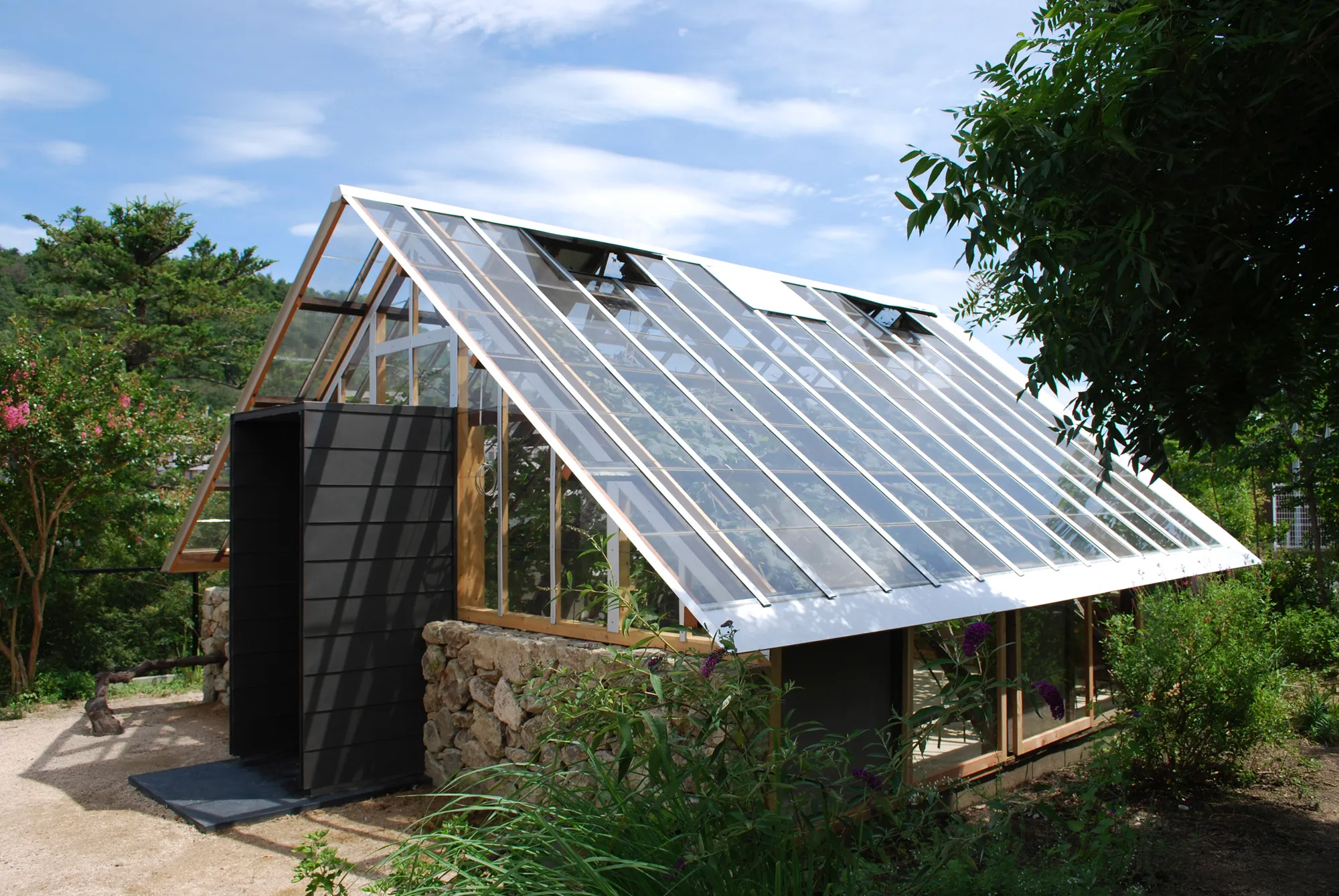 約18mのマスカット栽培用の温室を、5.4mに縮めて再生して生まれたガーデンハウス。