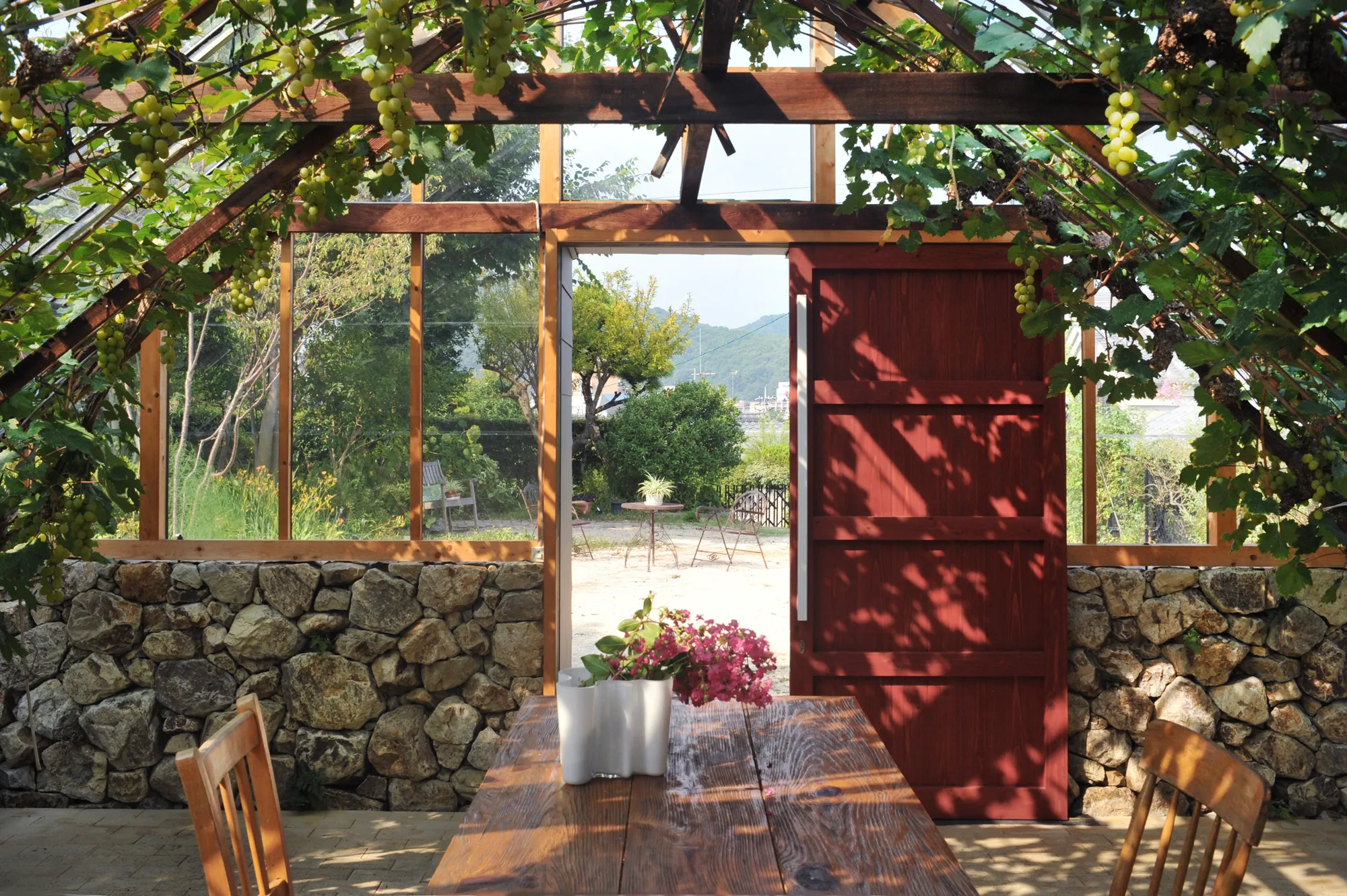 温室の土の上に敷いた白い煉瓦には、木漏れ日が差し込みぶどうの葉の影が美しい模様を作り出します。木製の壁は、白い塗装にひと手間加えることで木目を活かしています。