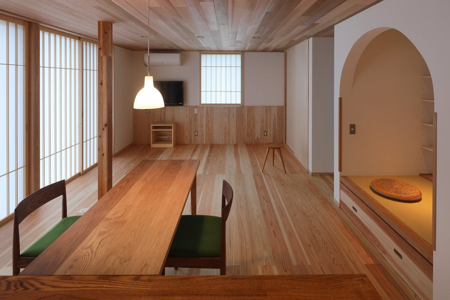 落ち着いた空間になるよう、天井はあまり高くせず、重心を抑えた設計としました。その分、圧迫感が出ないよう、窓及び内障子は天井高目一杯の高さに設定し、開放感を得られるようにしています。天井や床、建具などに木材を多用しているため、単調な印象になりがちですが、各パーツで木材の種類を変え、それぞれの木材が持つ表情を活かすことで、空間にメリハリがつき質の高い空間となりました。