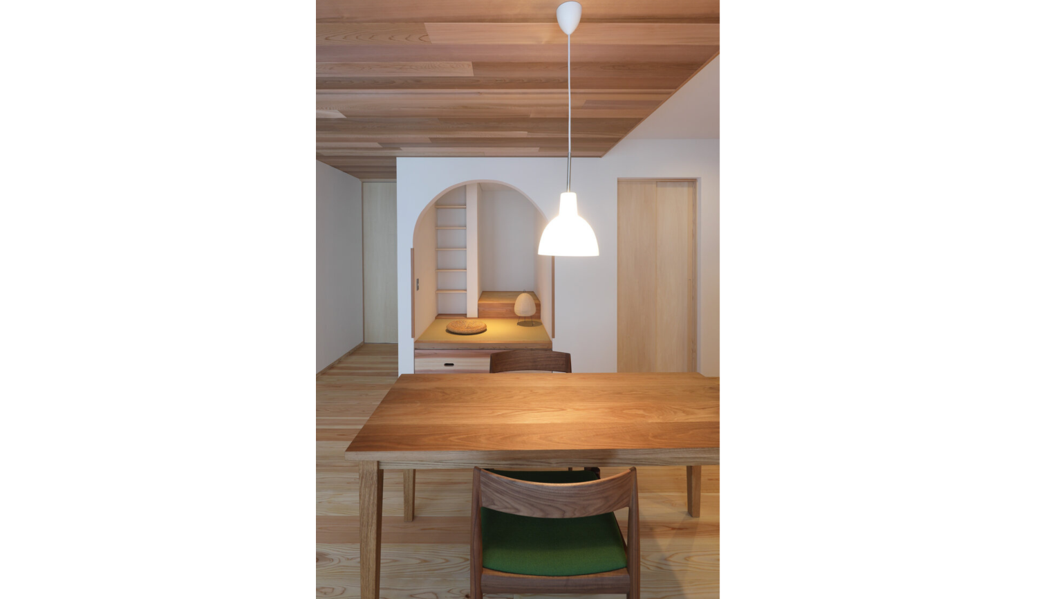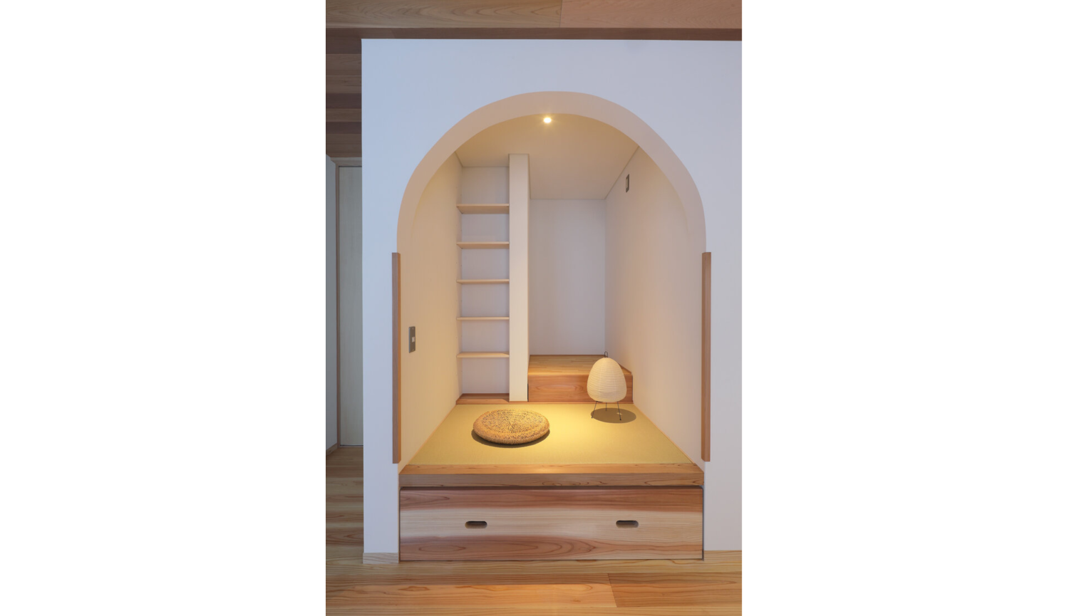 元リビング収納だった場所には、1畳にも満たない小上がりスペースを設け、その奥に仏壇置場を置くことで将来、お仏壇を引き取った際に空間全体に違和感がでないように工夫しています。この籠り感のあるスペースは、お子様が帰省された際には、定位置となり一日の大半をここで過ごしたり、又奥様が読書をする場所になるなど、ご家族の皆さんにとって、とても大切な場所となっています。