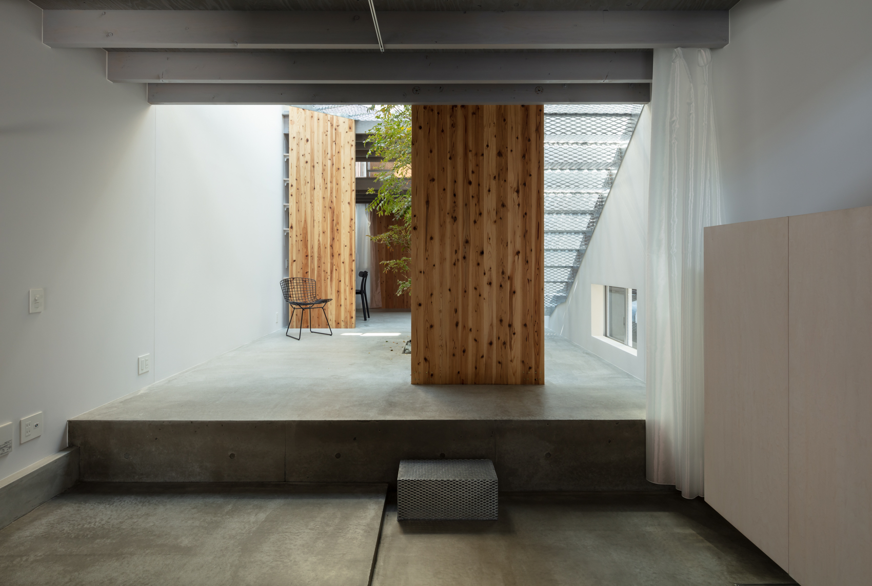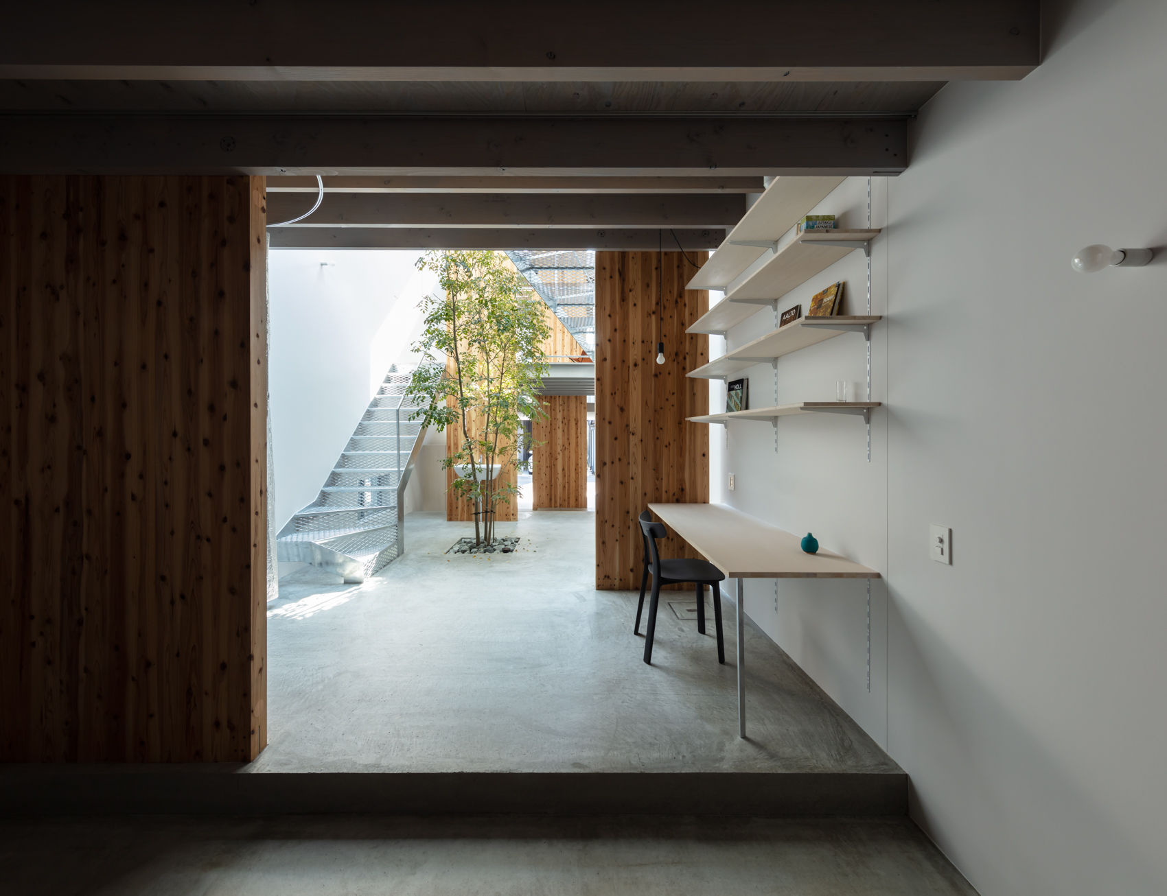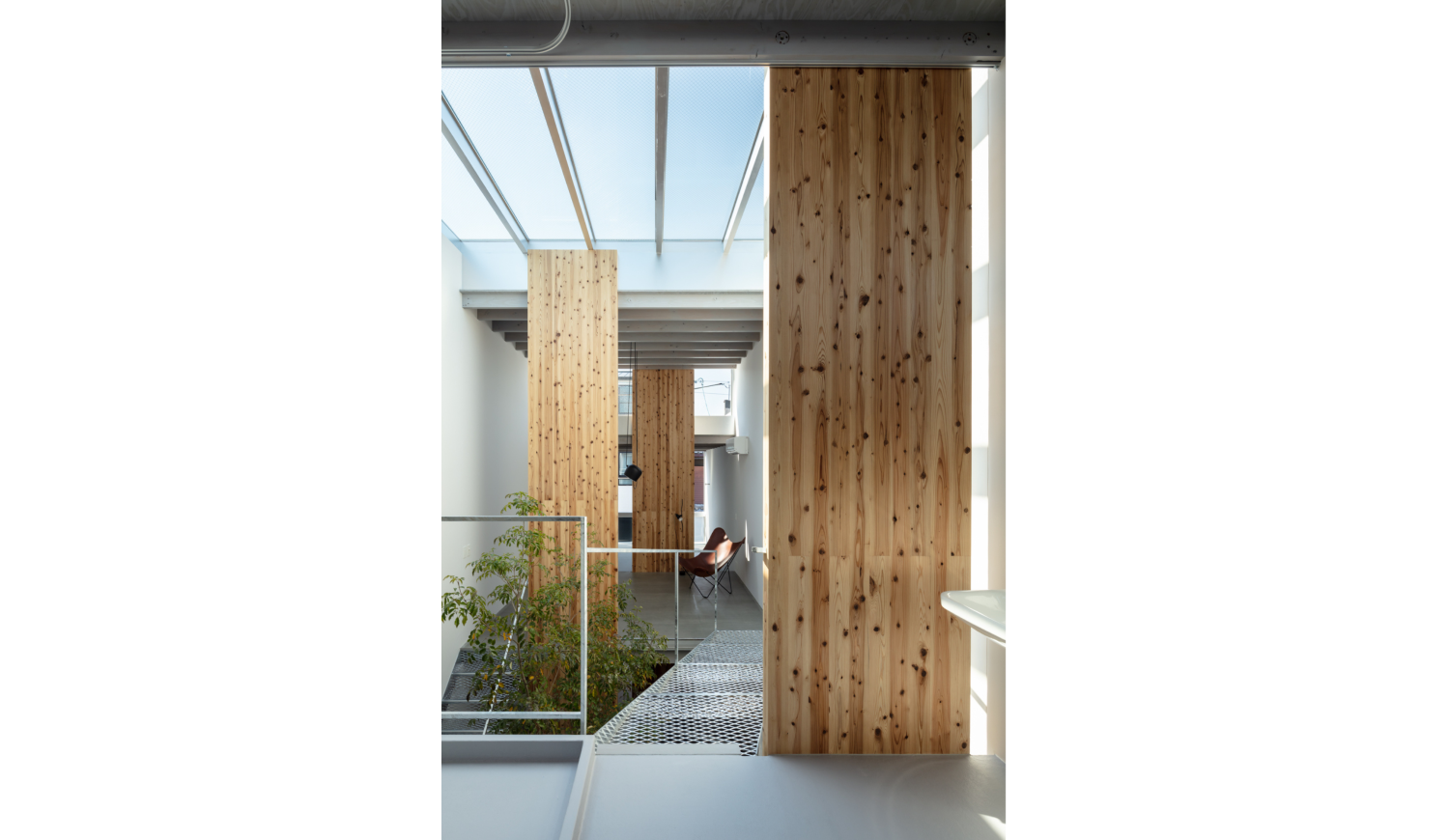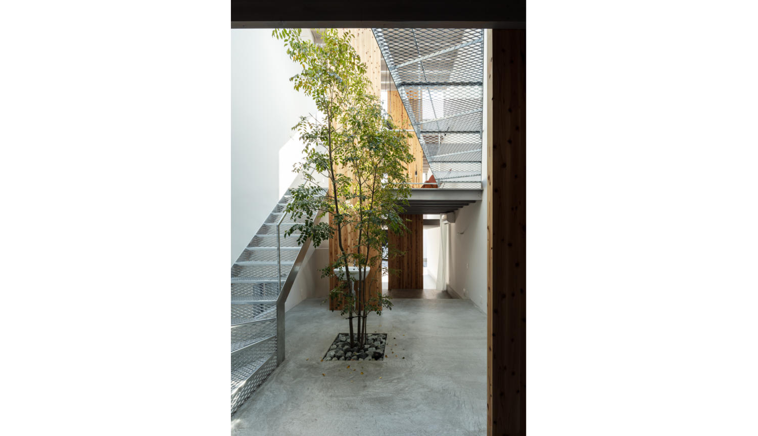 住宅の中心に位置するインナーテラスでは、トップライトの光を効果的に取り入れています。天井からの光がエキスパンドメタルの階段をキラキラと輝やかせ、空間全体に明るさと奥行きを与えます。