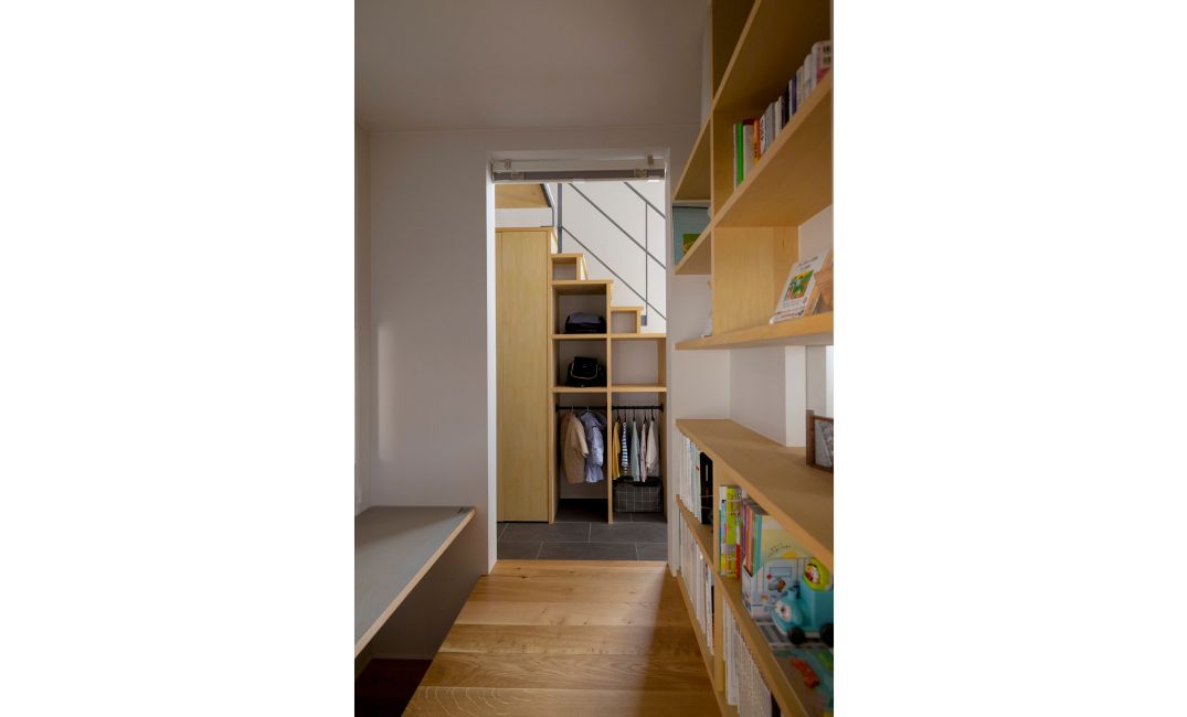階段下の収納は、衣類や鞄の片付けや準備が自分でできるよう、手が届く高さに設計しています。帰宅時には廊下の洗面台で手洗いをしてそのまま物の置き場にくることができるので、自然と片付けが身に付きます。
