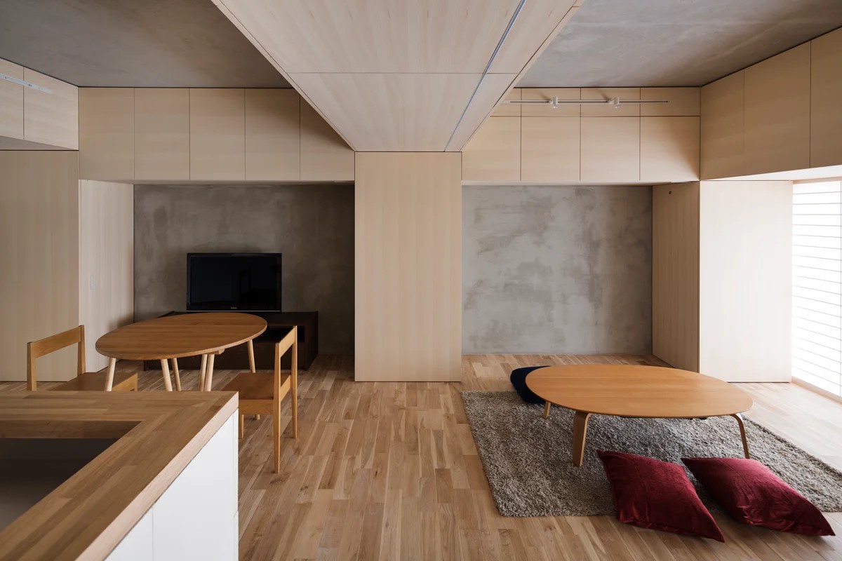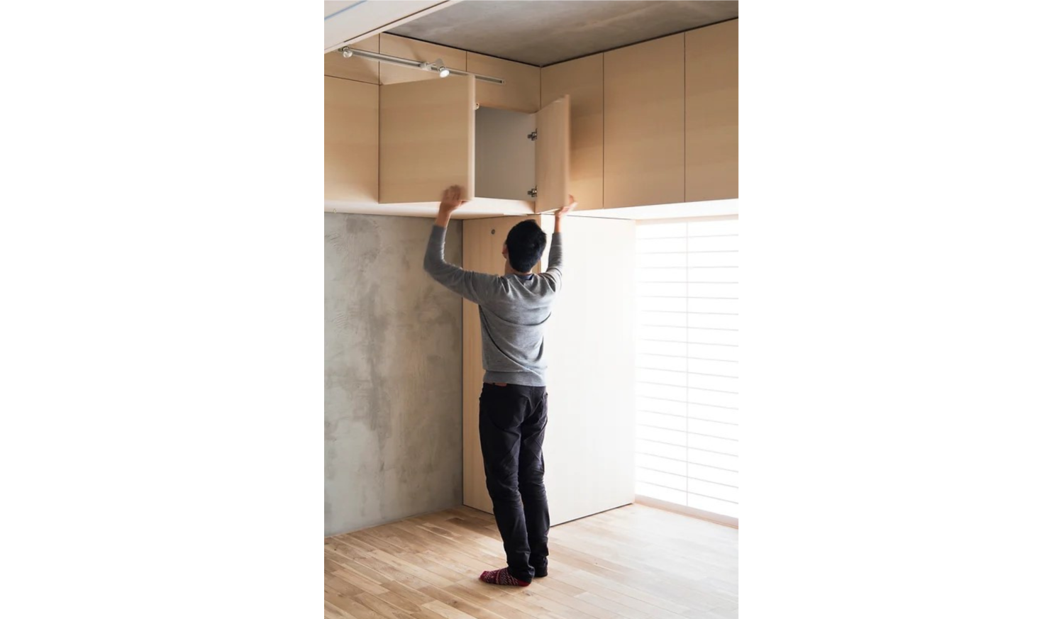 室内に出っ張っている柱梁に収納や設備スペースを集め、効率的に大きな収納をつくりながら、その他の部分の仕上げの嵩上げを極めて小さくすることで、居住空間を広くしています。それによって生まれた窪みは、机やベッドを配置するきっかけとなり、そこに住まい手の居場所がつくられていきます。そして居場所からはすぐに収納にアクセスできるため、常に綺麗な状態を保つことができます。