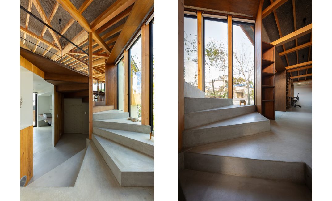 その中で、肝ともいえるのが家の中心部に設けた緩やかな螺旋階段です。庭の植栽を囲むようにL型に配した建物の、2方向の付け根にあたる部分にこの階段はあります。段差を昇る、降りるごとに、ワークスペースやリビングなど違う空間が展開し、窓の外には庭からテラスへと旋回しながら景色が開けていきます。