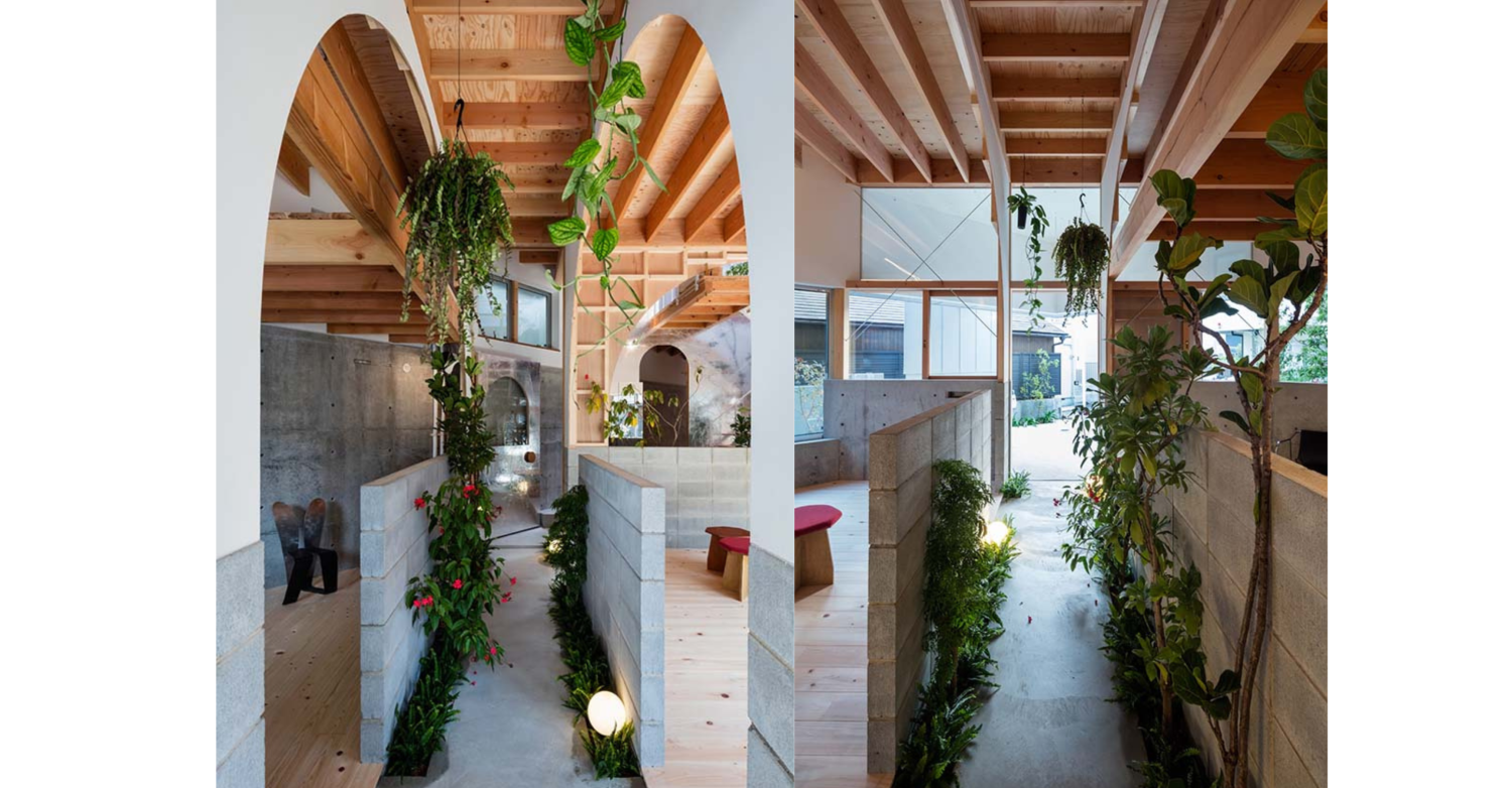 廊下の植栽が路地のような雰囲気を醸し出し、インナーガーデンに接する部屋はまるで小さな街にいるような気分になるデザインです。