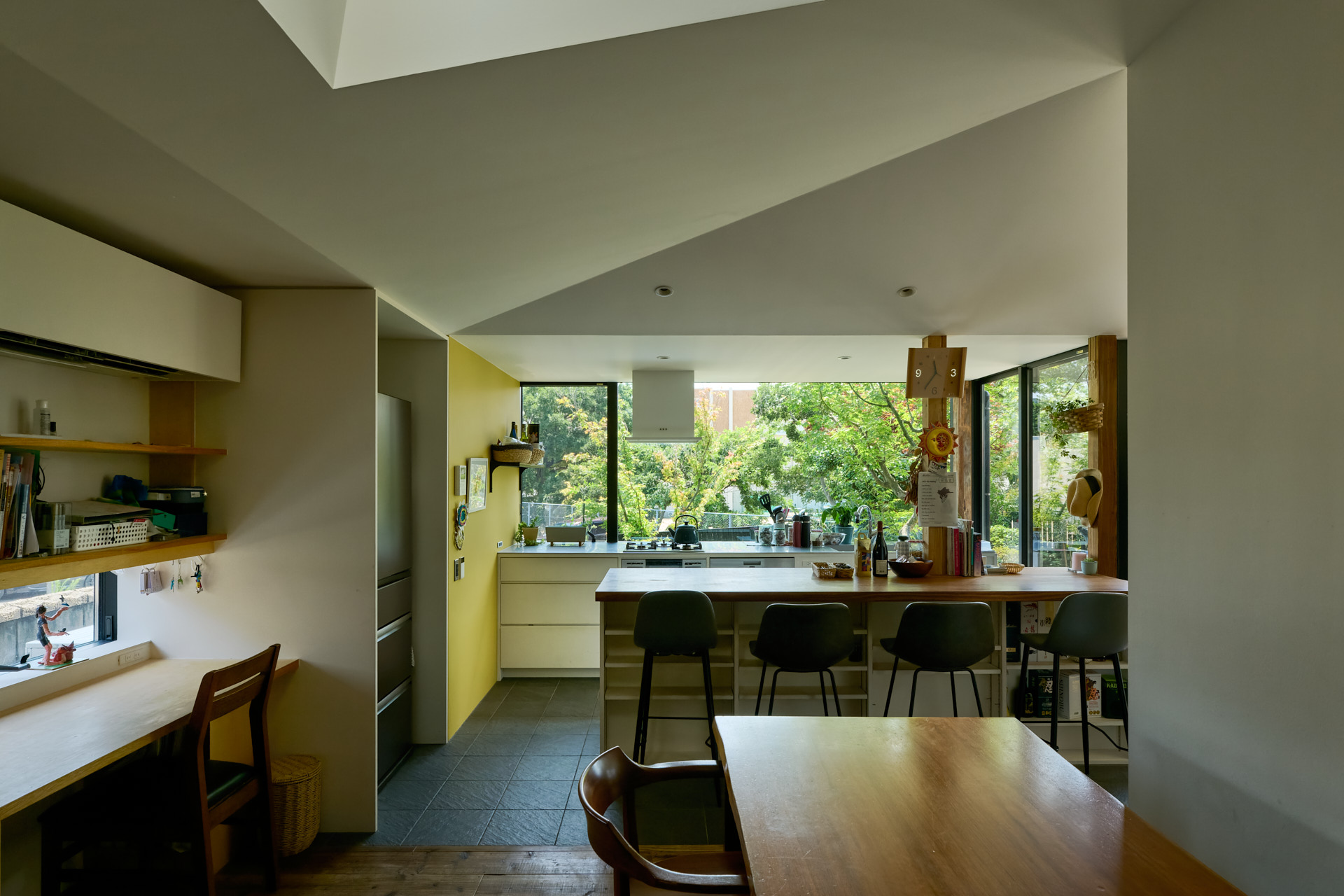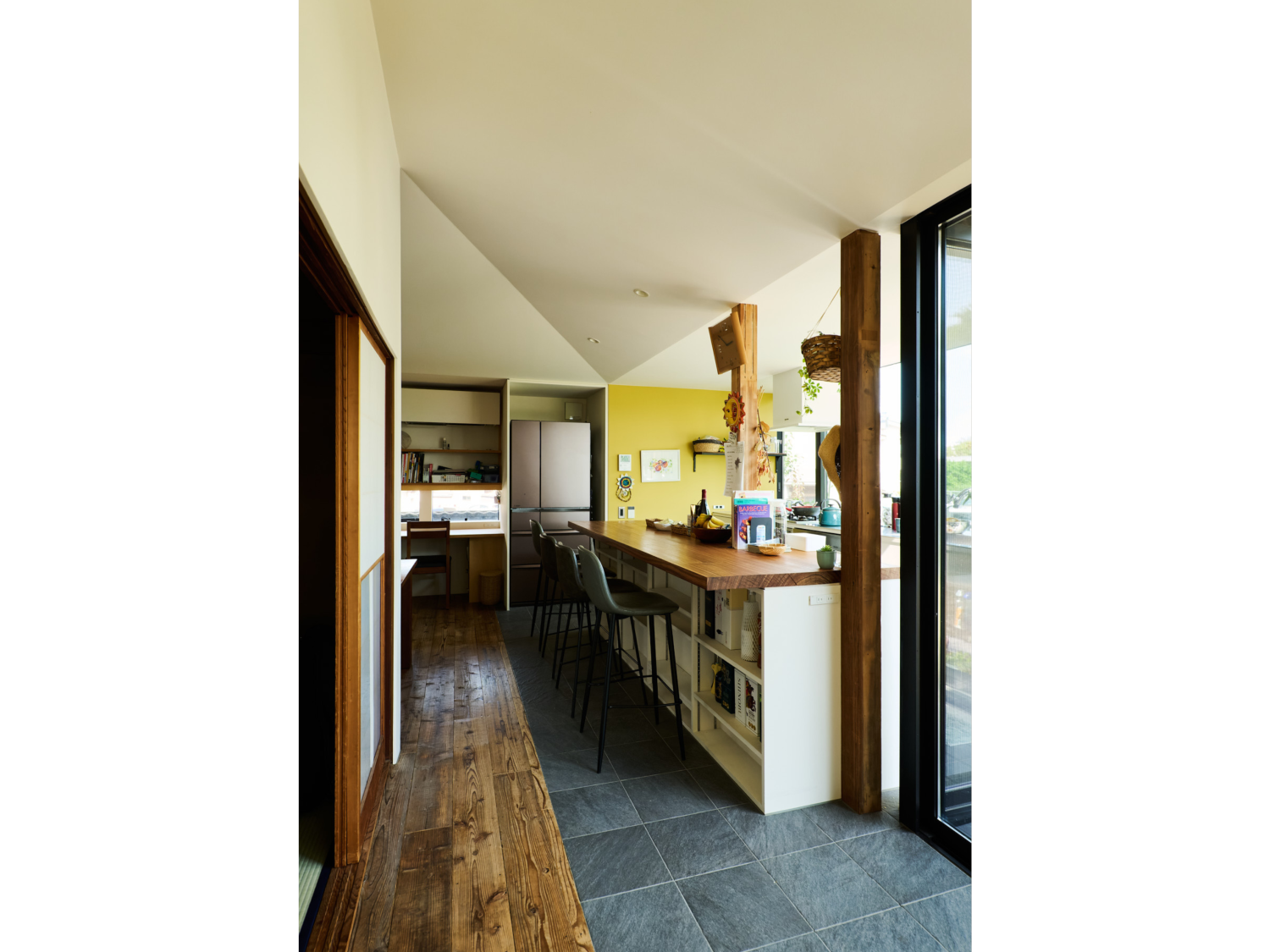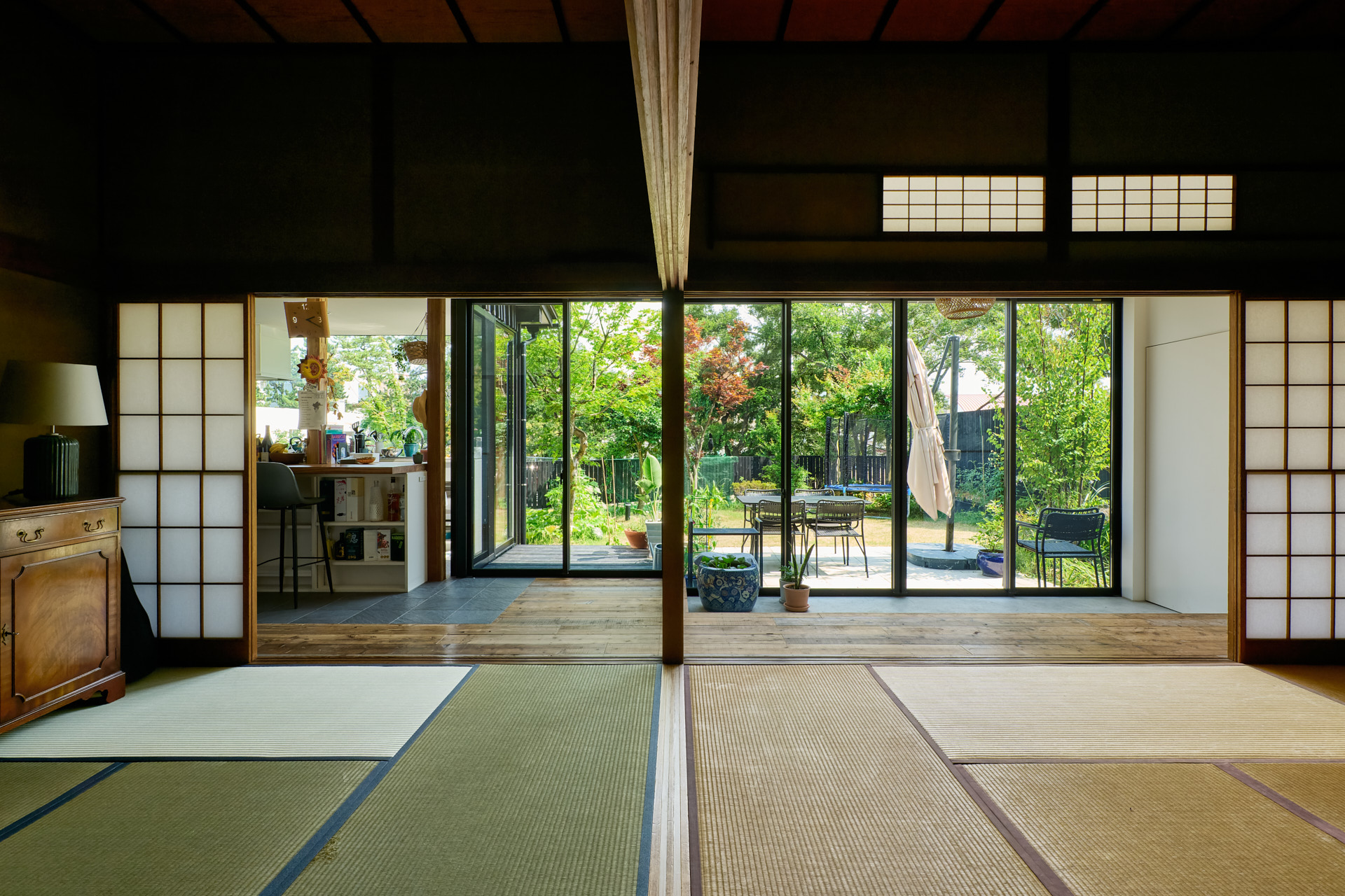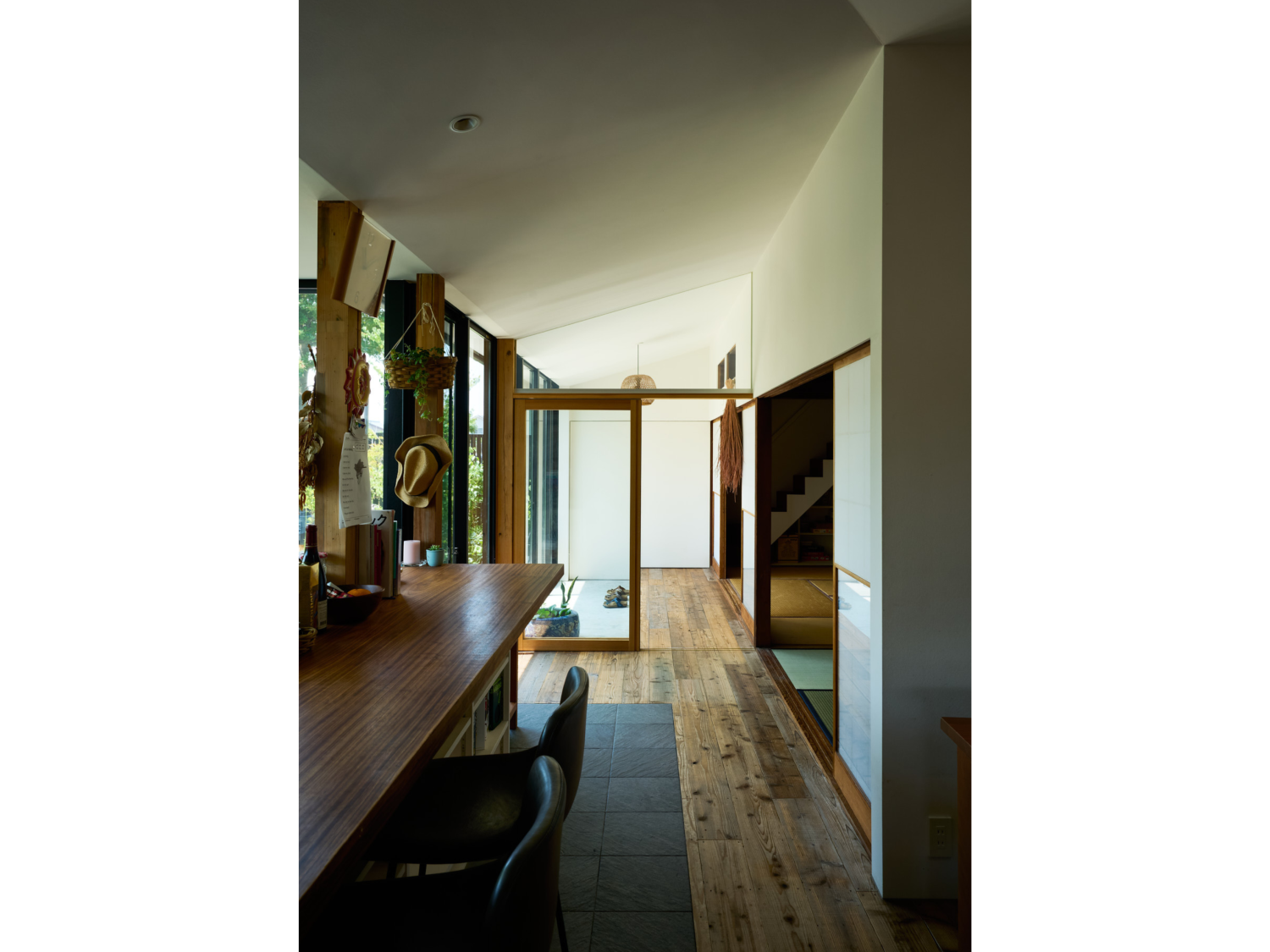 元々住宅とは切り離されていた美しい庭を活かし、新しく設けた土間が住宅と庭を緩やかにつなげます。家の奥にあったキッチンは、庭の景色を楽しむことができるように庭に隣接するように再構築しました。