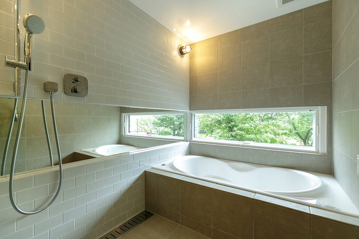 2階の浴室に桜や植栽方向を臨むことができる横長の窓を設け、その窓とL字になるようラインを揃えて、同じく横長の鏡を設置しています。これにより、鏡の中にも外の景色が映し出され、まるでL字の窓のように視界が広がり、浴室の閉塞感を解消してくれます。