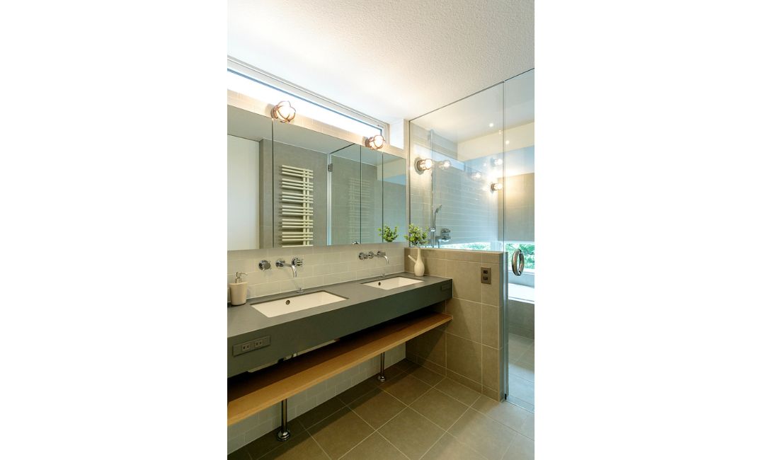 さらに空間を広がりのあるものとするため、脱衣洗面所との間もガラス仕切りにして、窓の外まで目線が抜けるように設計しました。洗面所と浴室の鏡側の壁面にも同じタイルを使用し、空間に連続性を持たせています。