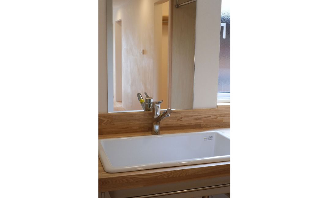 『小さな土地の2階リビングの家』の洗面所は当初、施主の方とは天板とボール一体型の人工大理石などの洗面台をイメージして相談していました。